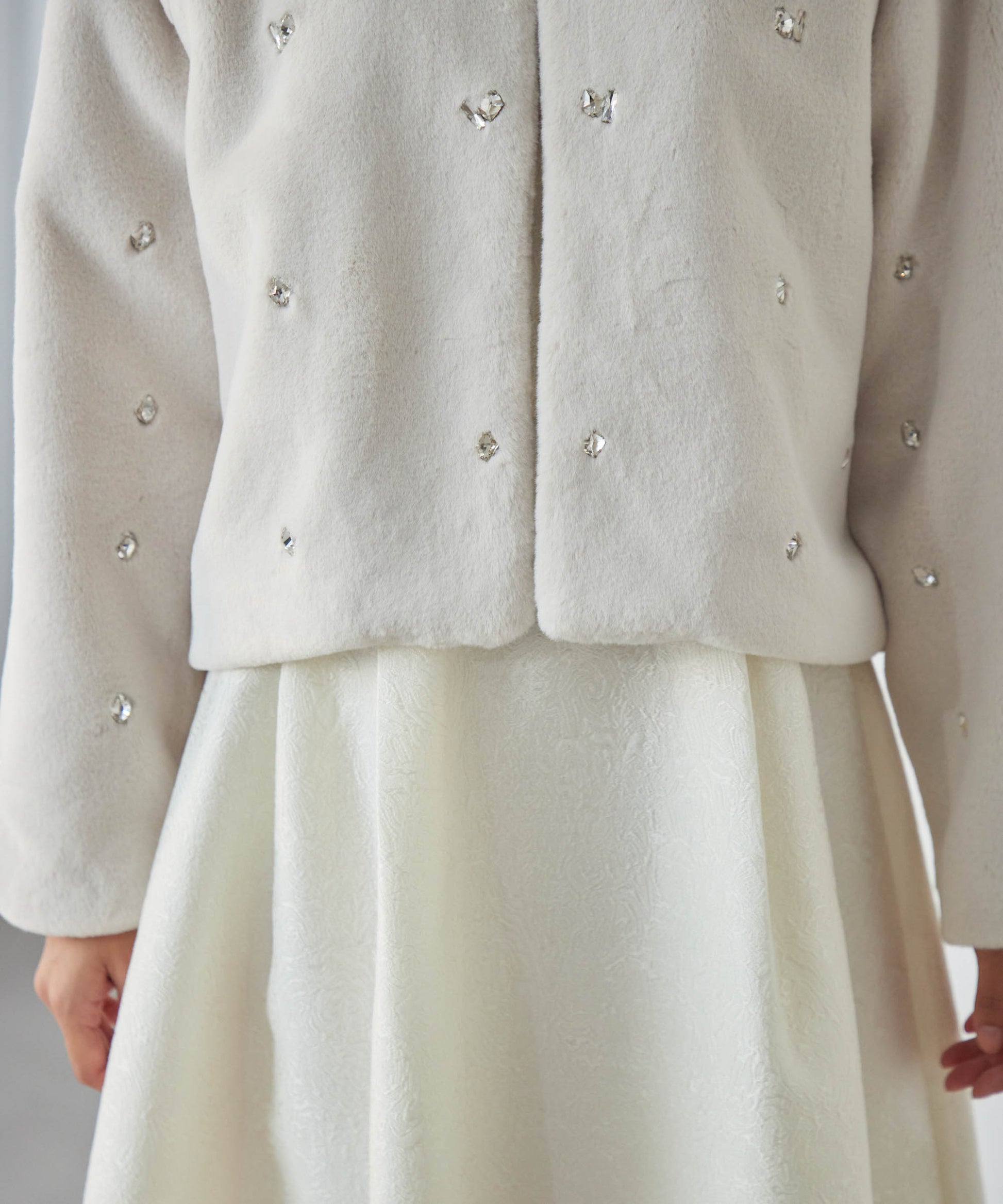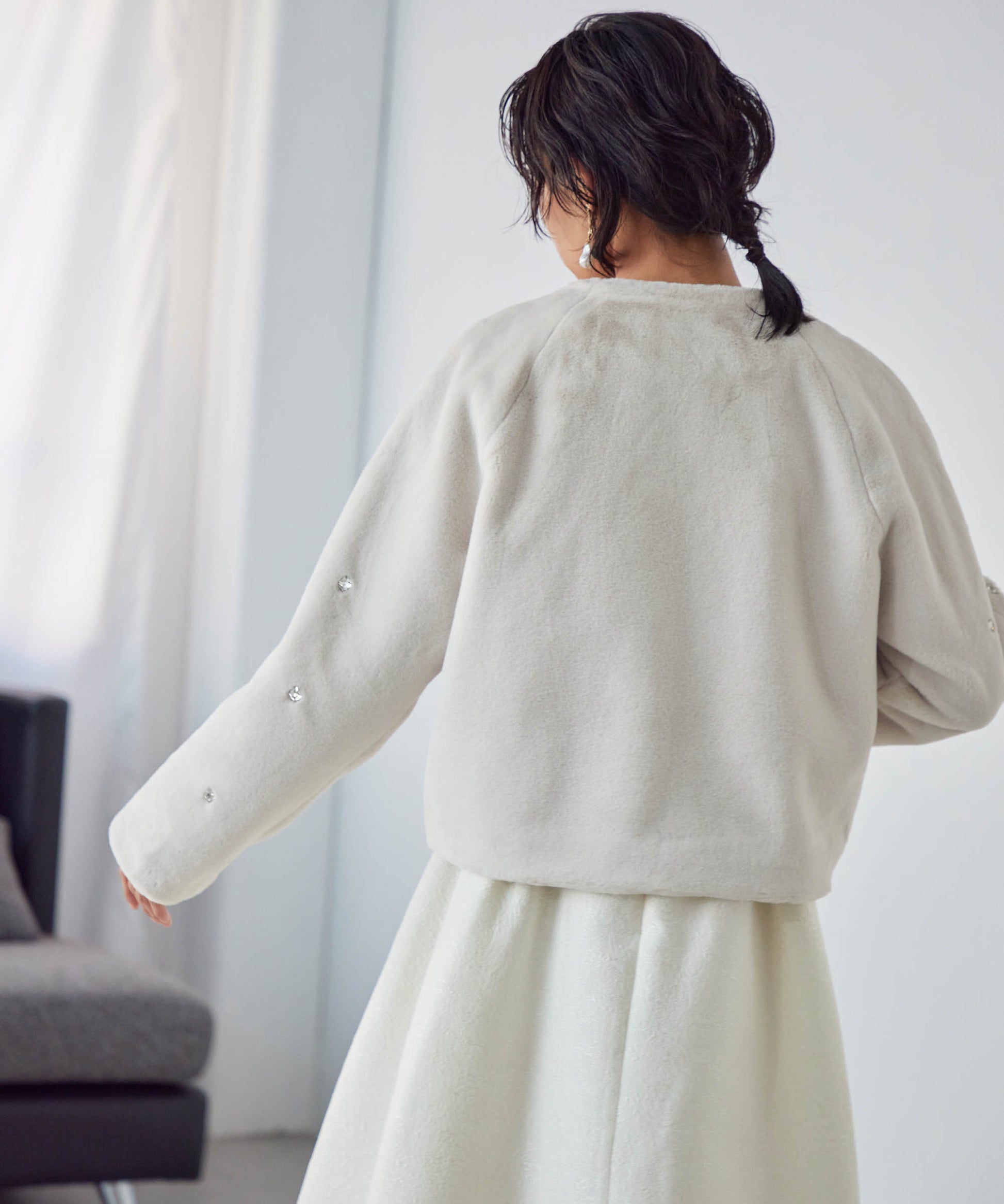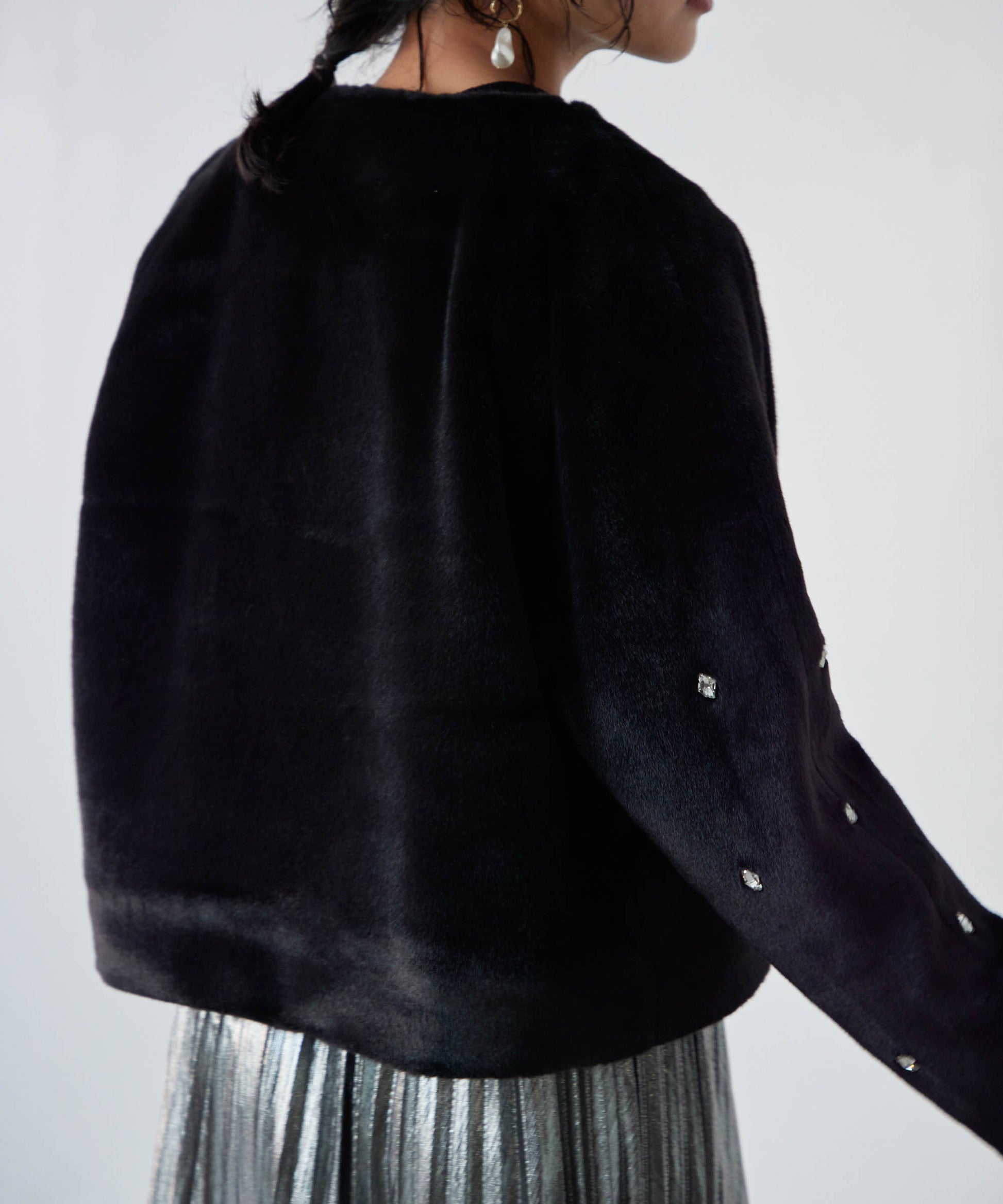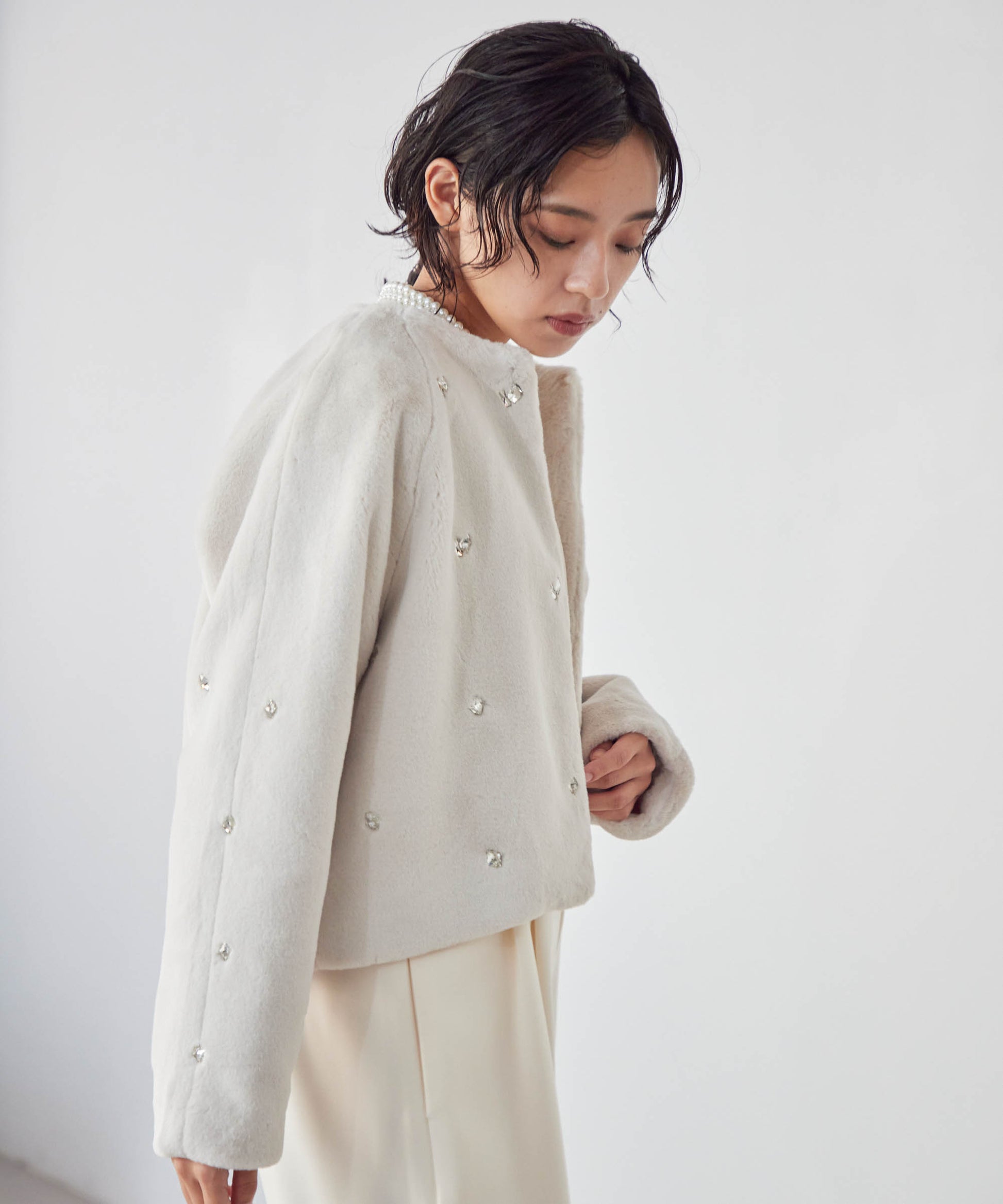 エレガンスなビジュー付きのファージャケットが新登場。ブラックとアイボリーの2つのカラーからお選びいただけます。