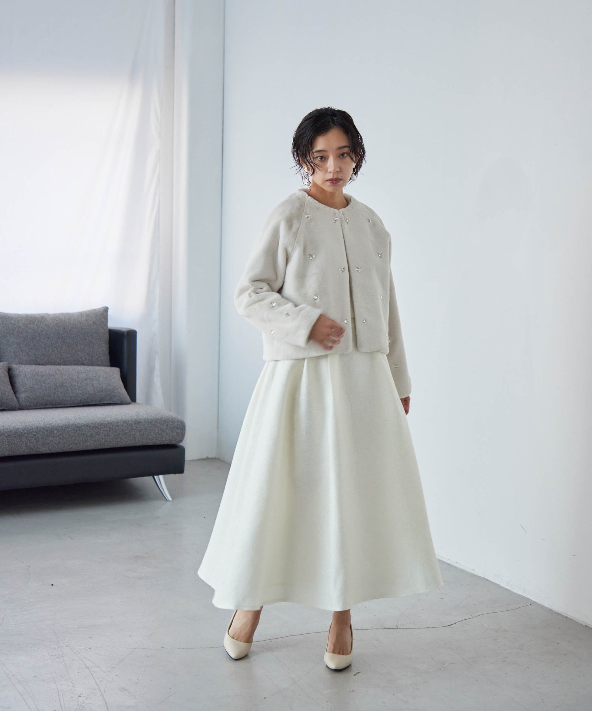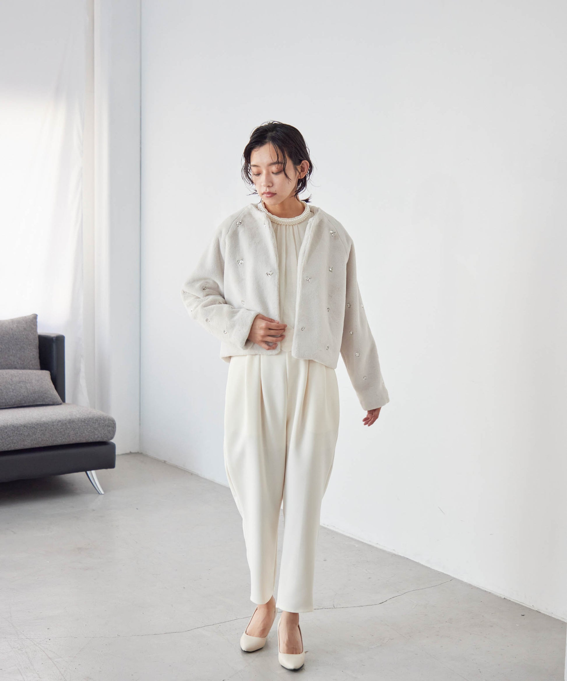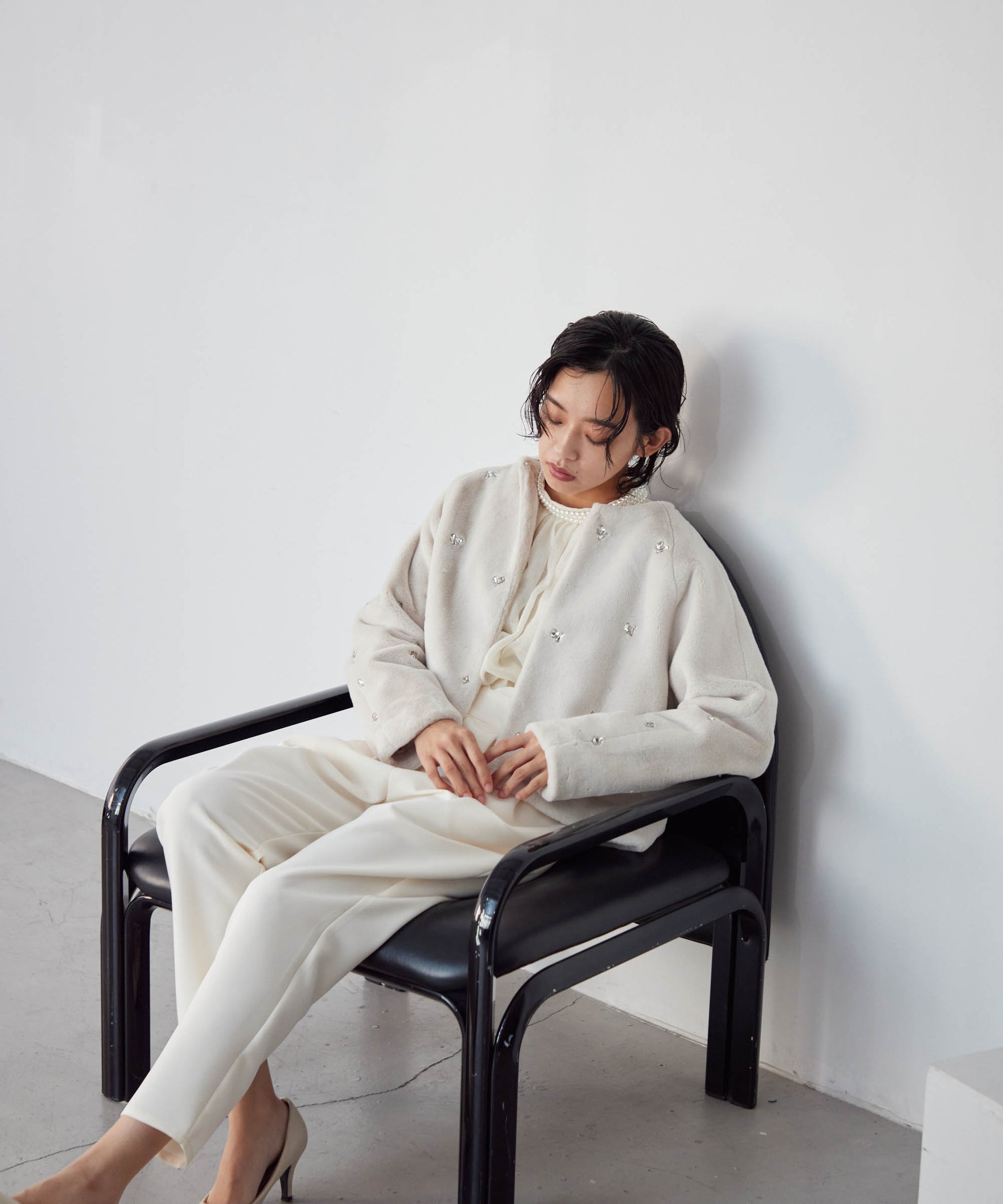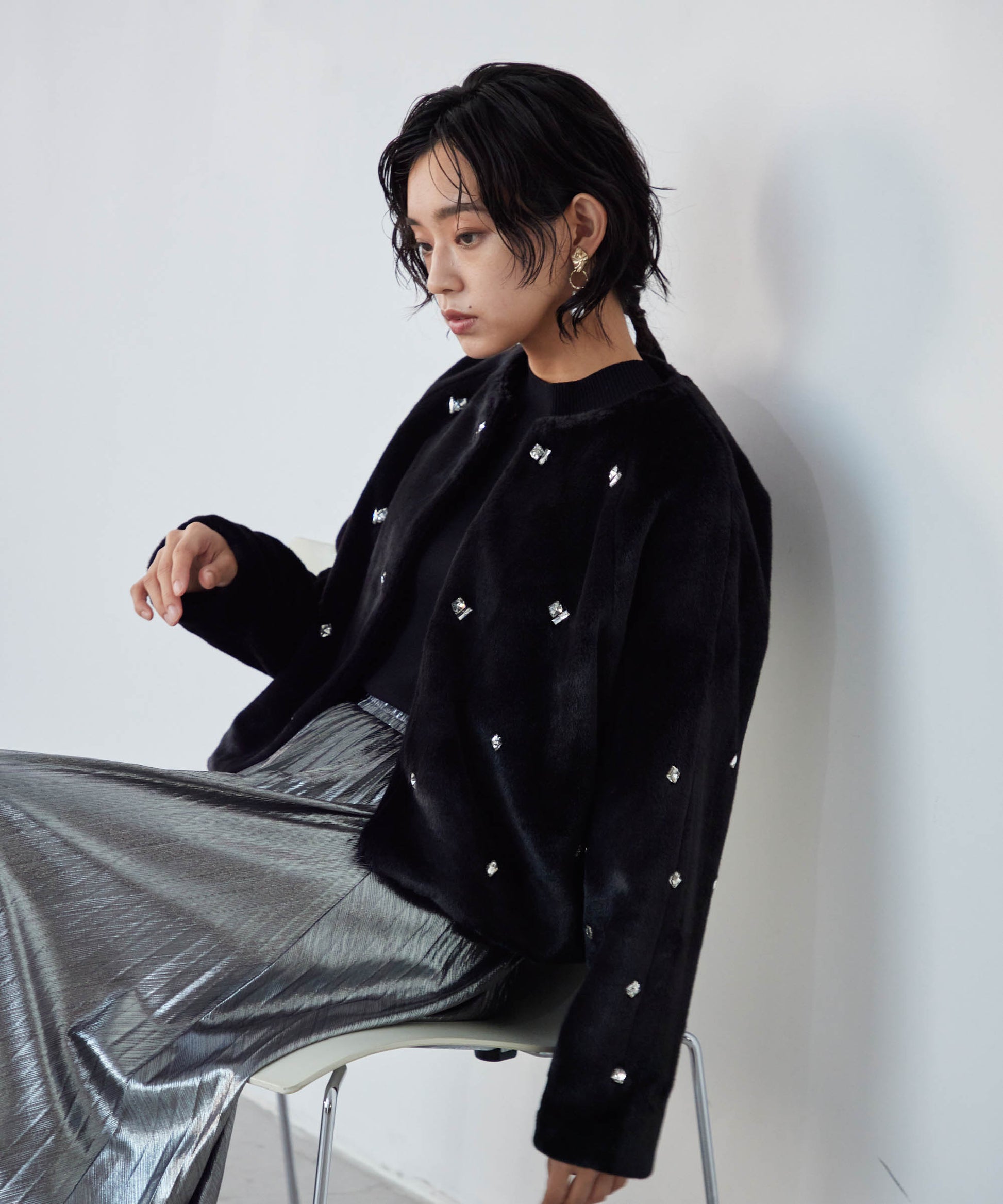 エレガンスなビジュー付きのファージャケットが新登場。ブラックとアイボリーの2つのカラーからお選びいただけます。
