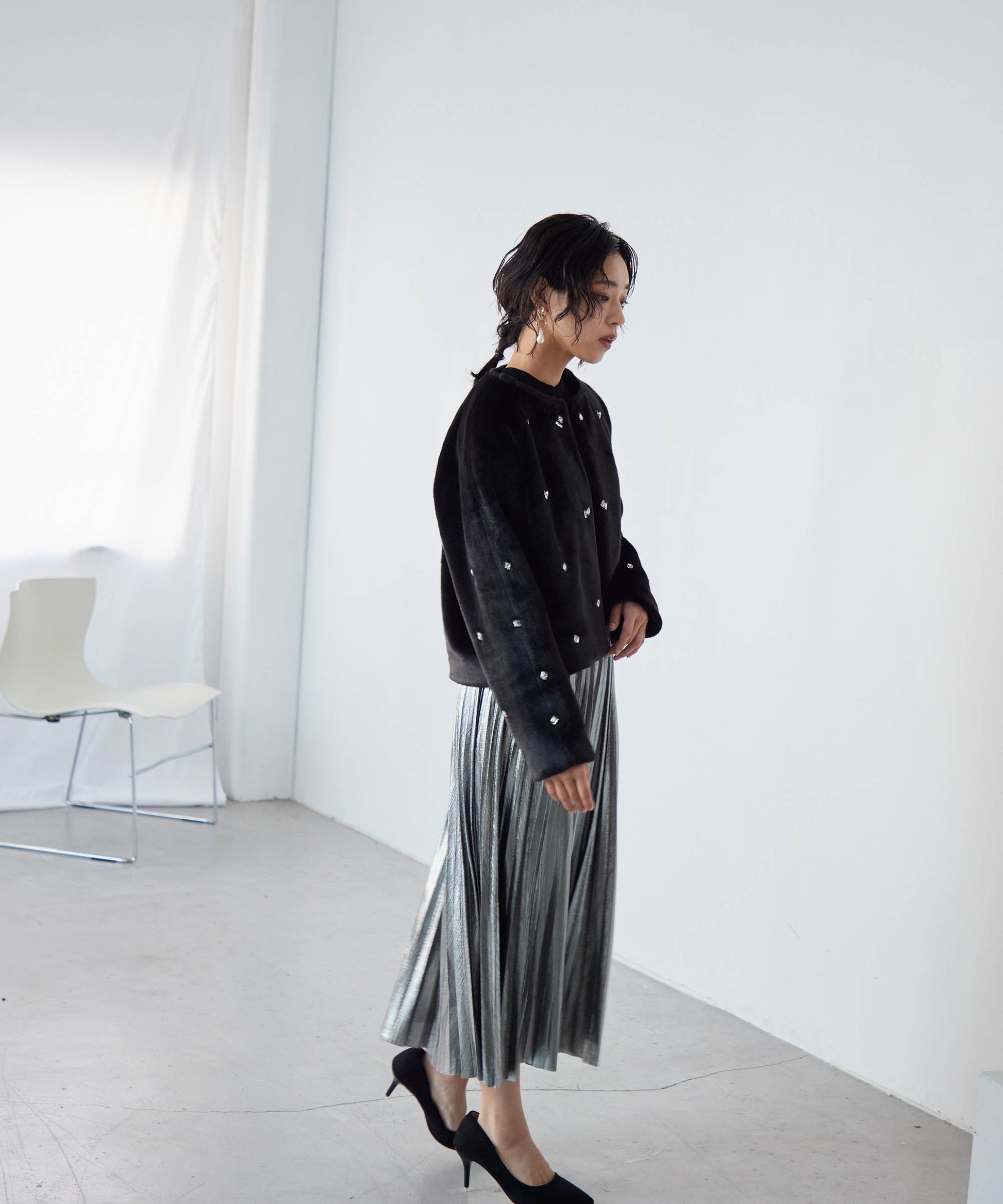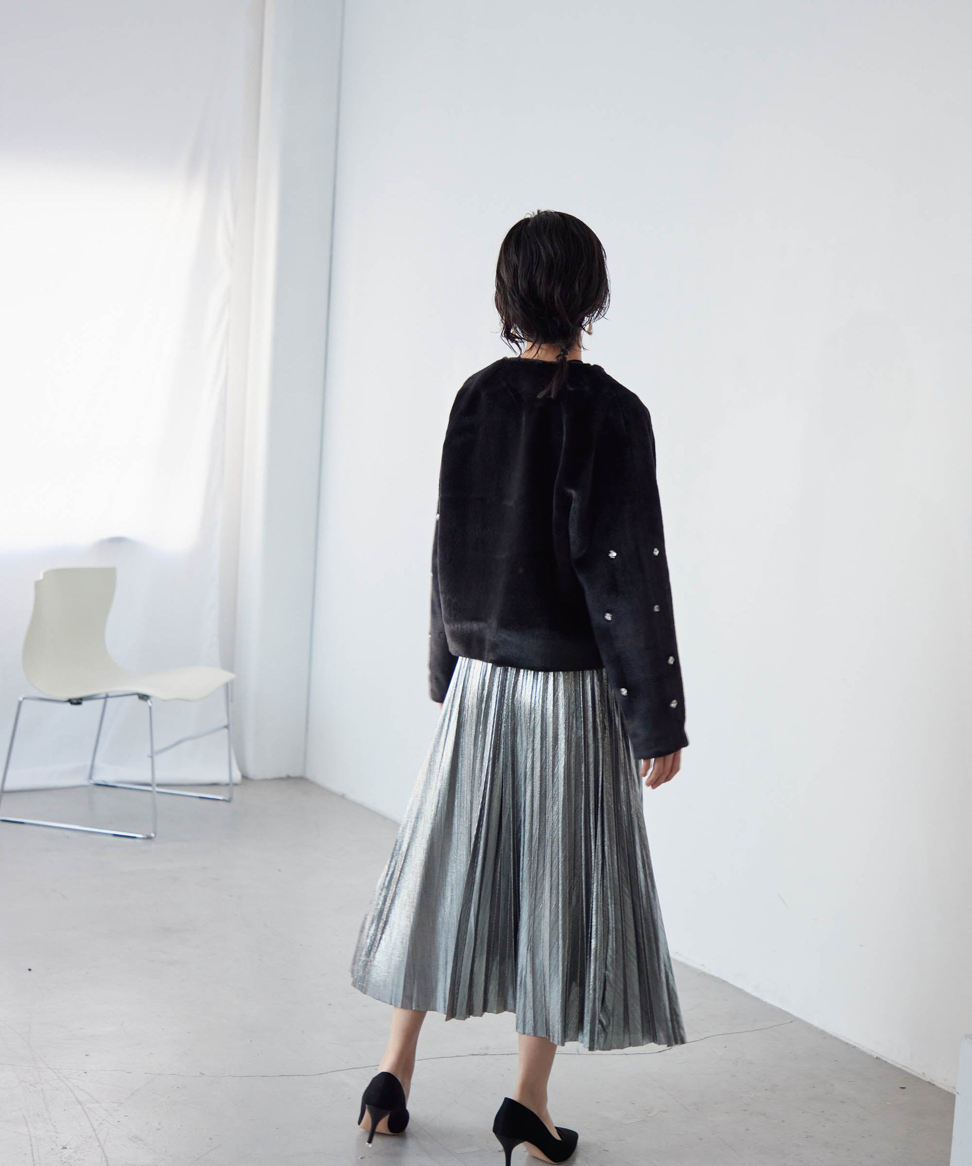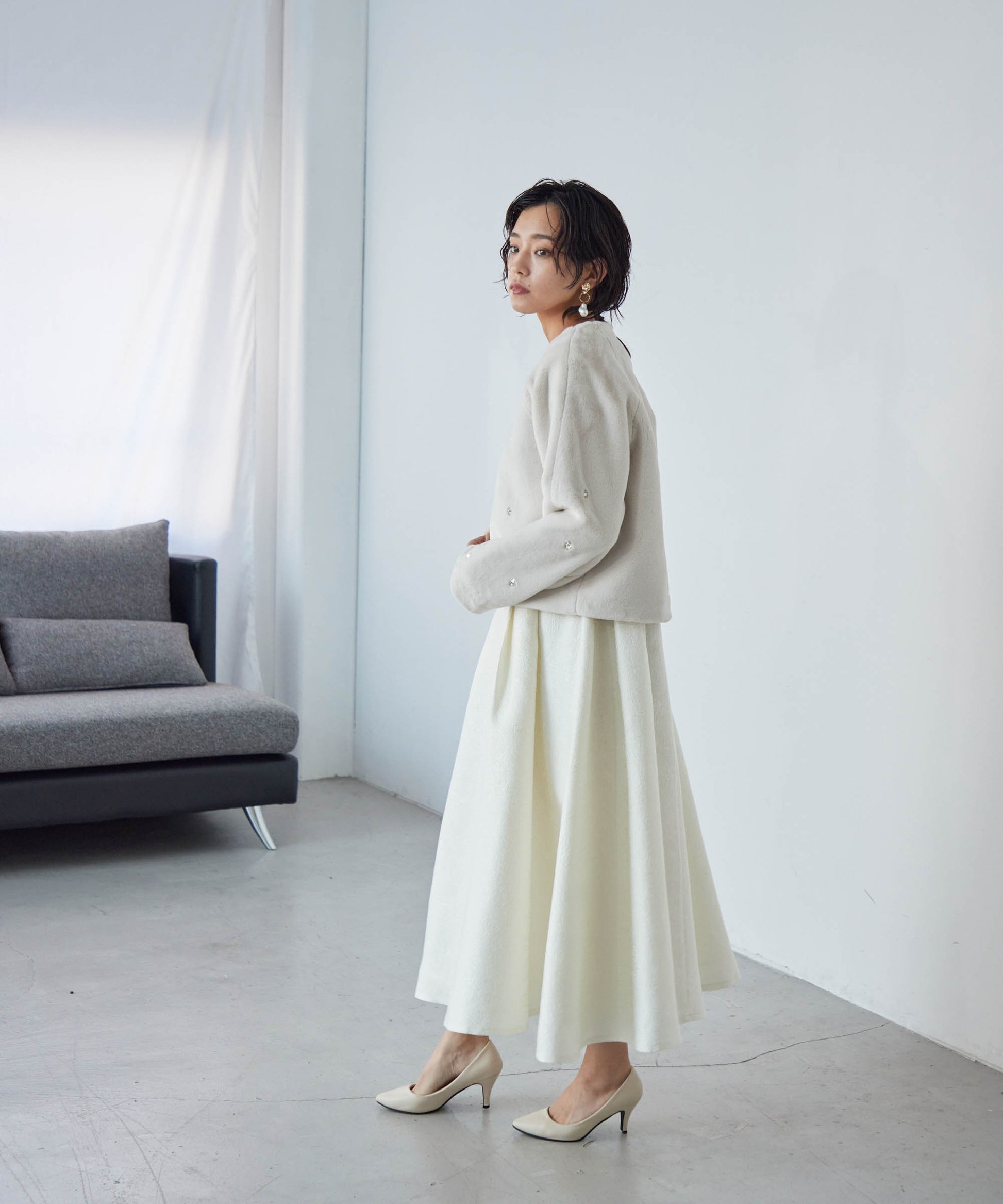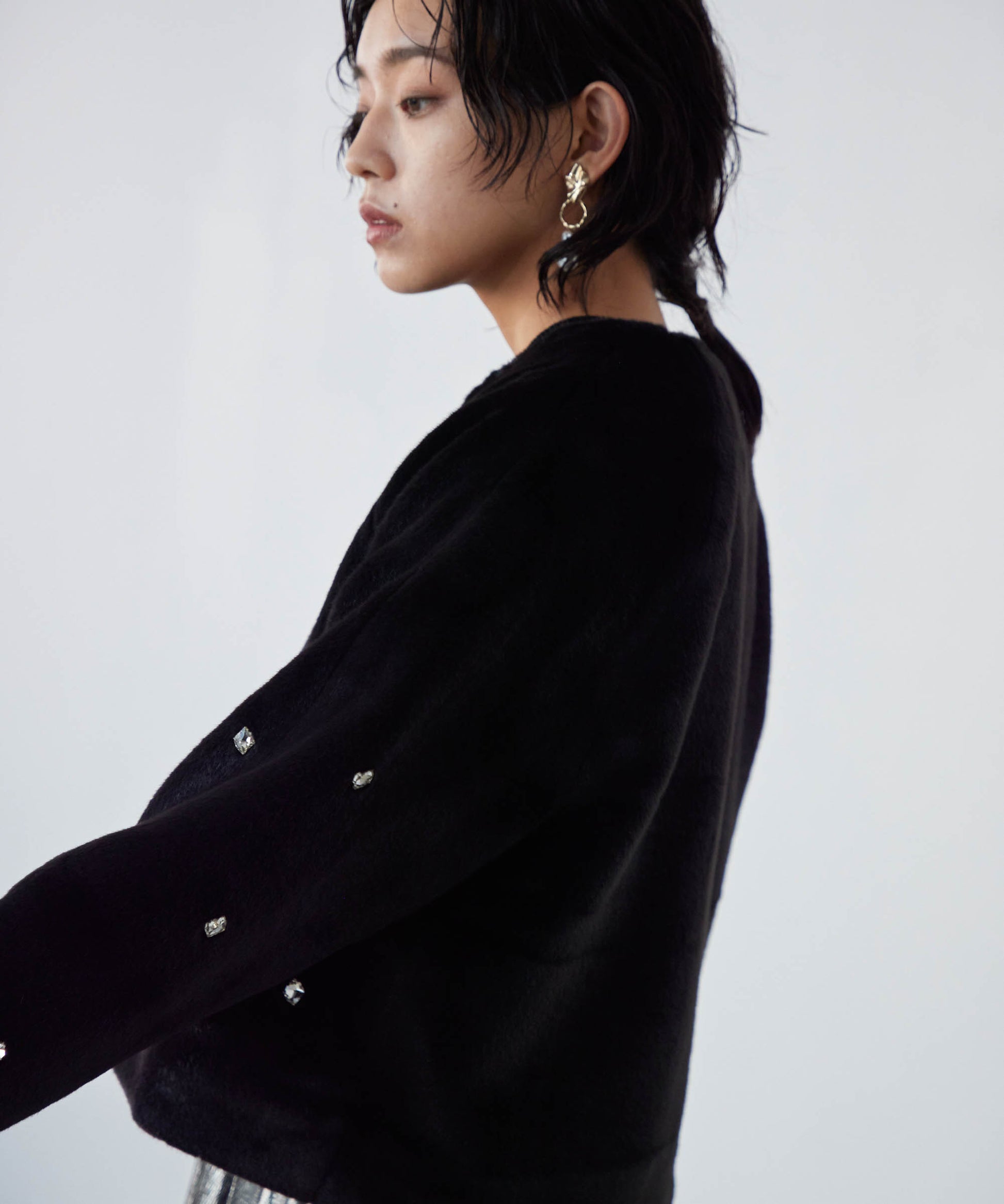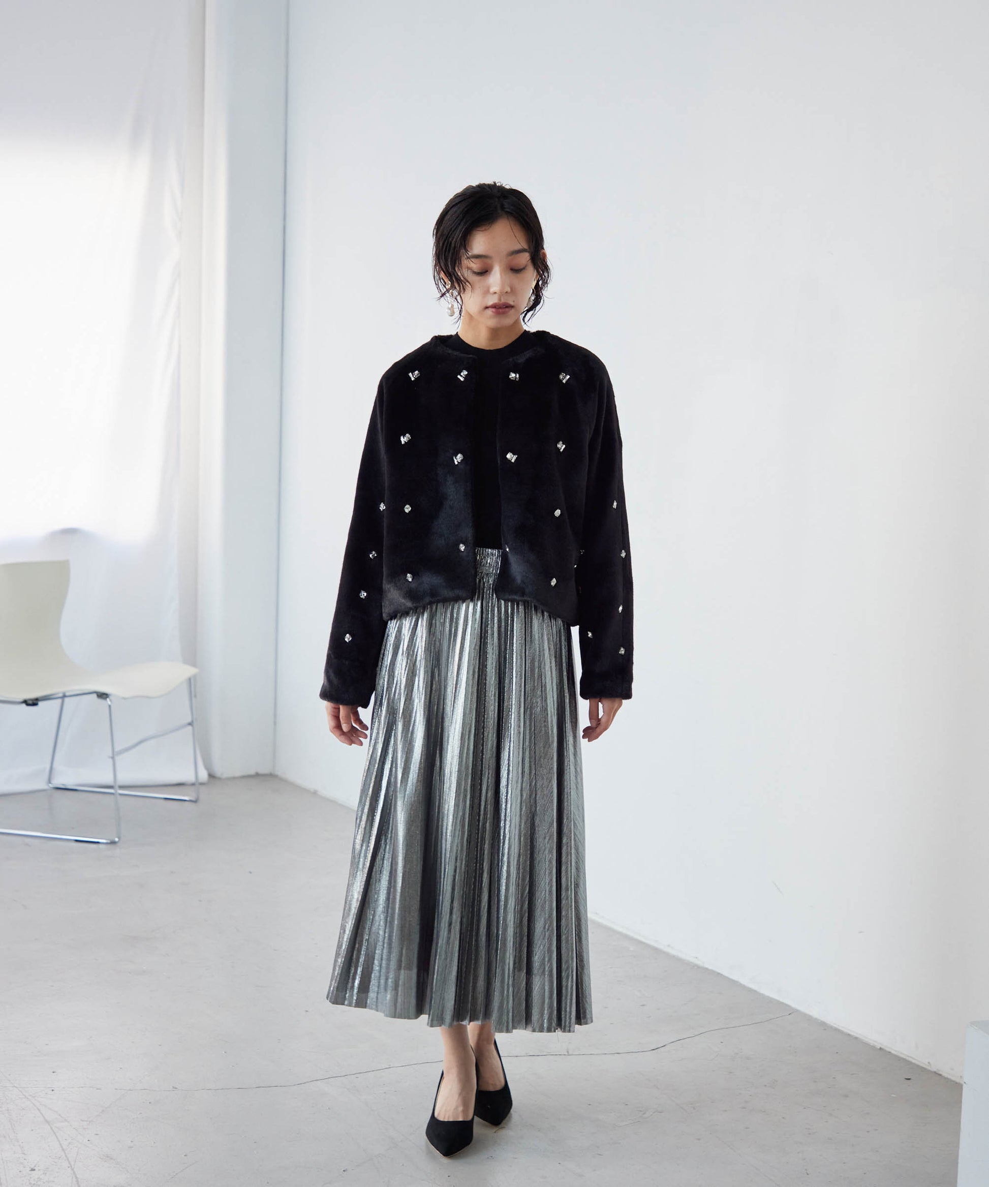 エレガンスなビジュー付きのファージャケットが新登場。ブラックとアイボリーの2つのカラーからお選びいただけます。