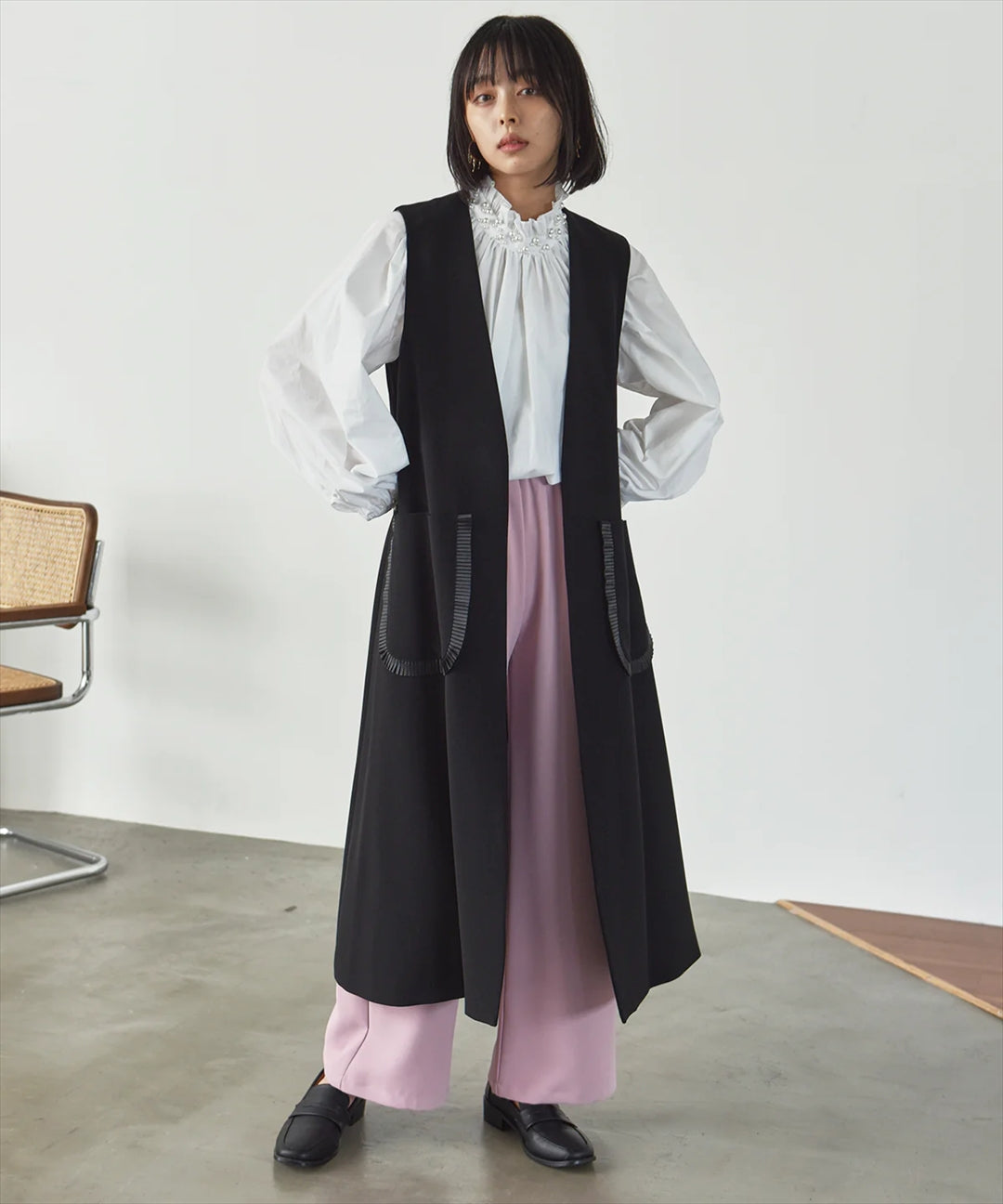トレンド感漂うスタイルを完成させる、プリーツポケット付きロングジレ。流行のプリーツデザインがポケットに施され、遊び心と実用性を融合させた一着です。シンプルながらも洗練されたデザインは、フォーマルな場面からカジュアルな日常まで、さまざまな場面で活躍します。トップスやボトムスとの組み合わせ次第で、多彩なコーディネートを楽しむことができる、オシャレなアイテムです。