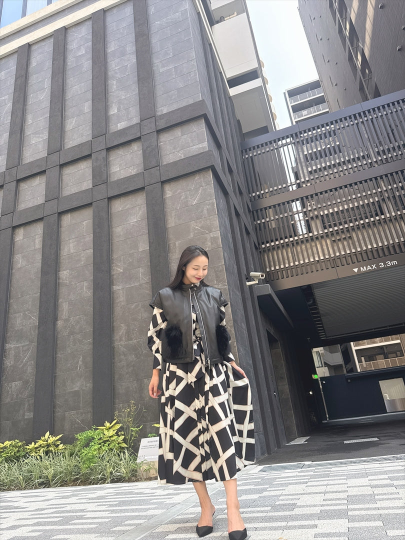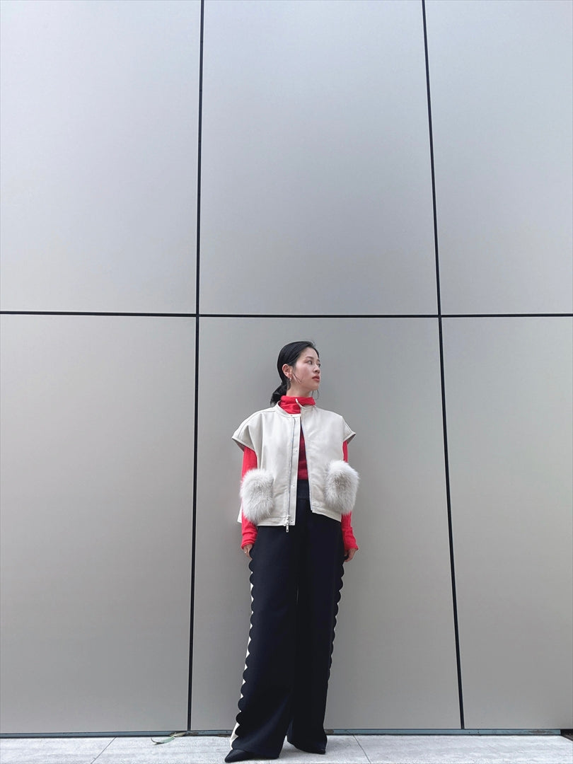 裏地のダウンの配色がカラーによって違うのもおしゃれなポイント。 (ブラック→カーキ、アイボリー→グレージュ、キャメル→ネイビー) ポケットのファーも取り外し可能なので、スタイリングに合わせて楽しめる 羊革のダウンベストです。