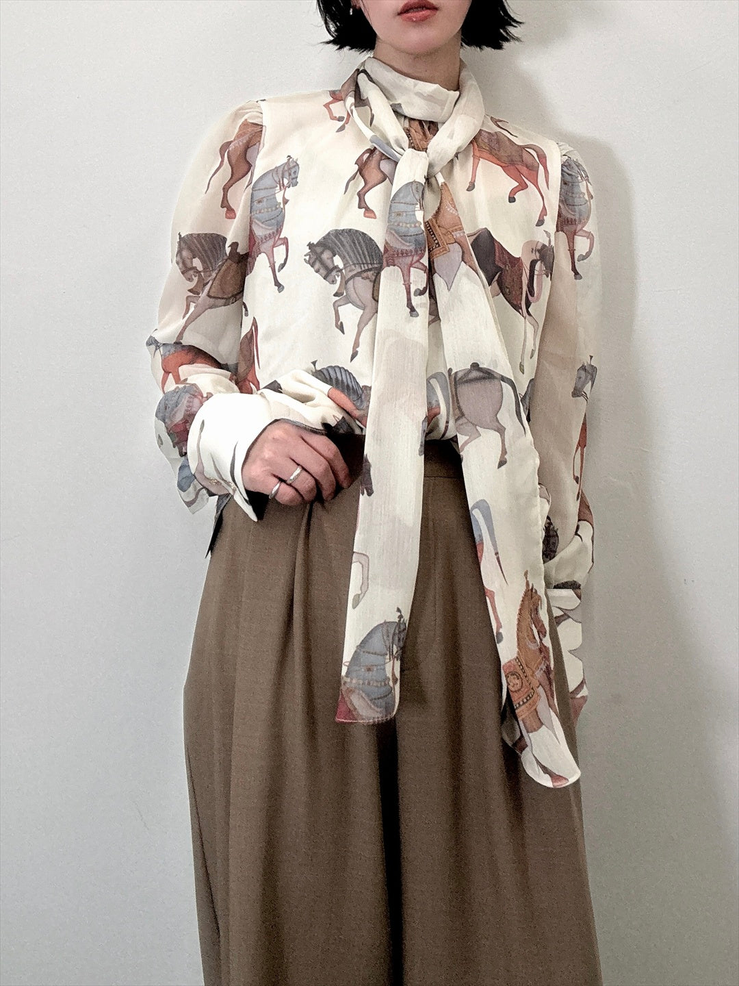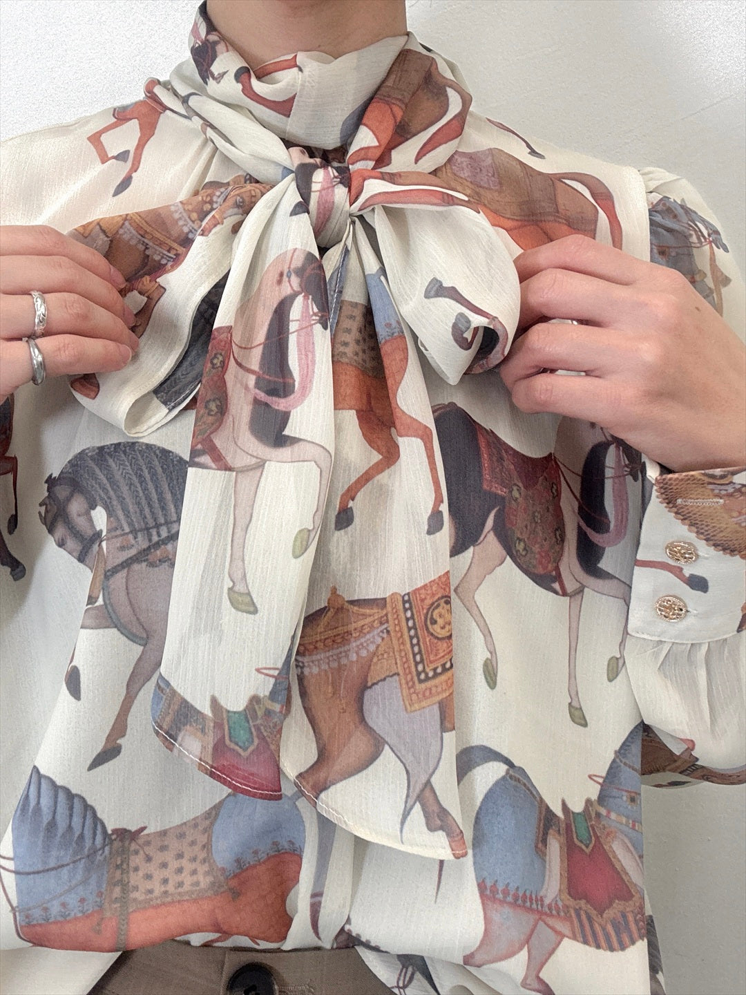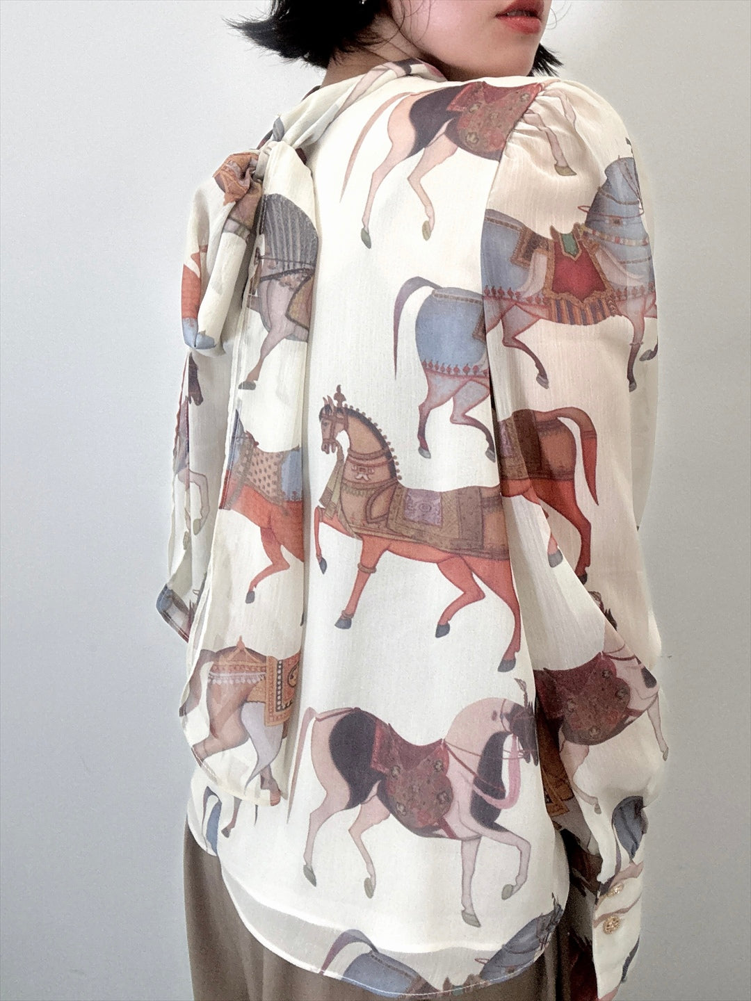 シフォン素材の馬柄がプリントされている柔らかなブラウス。首元には、ボリューム感のあるリボンがついていて前後2way仕様で着ていただけます。春先は、キャミソールと合わせて秋冬はレイヤードで合わせてオールシーズン使っていただけます。