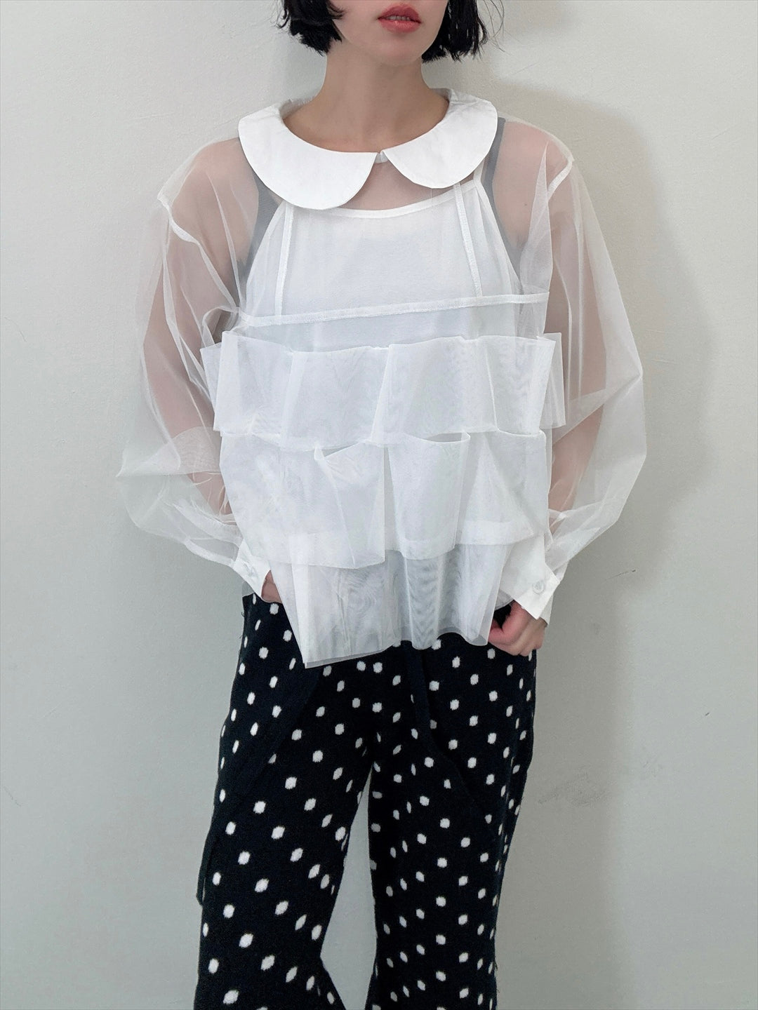 チュールの3段フリルがついたブラウス。シアー素材なのでインナーに合わせて色んなコーディネートが楽しめるアイテム。レイヤード次第でオールシーズン使える万能アイテムです。