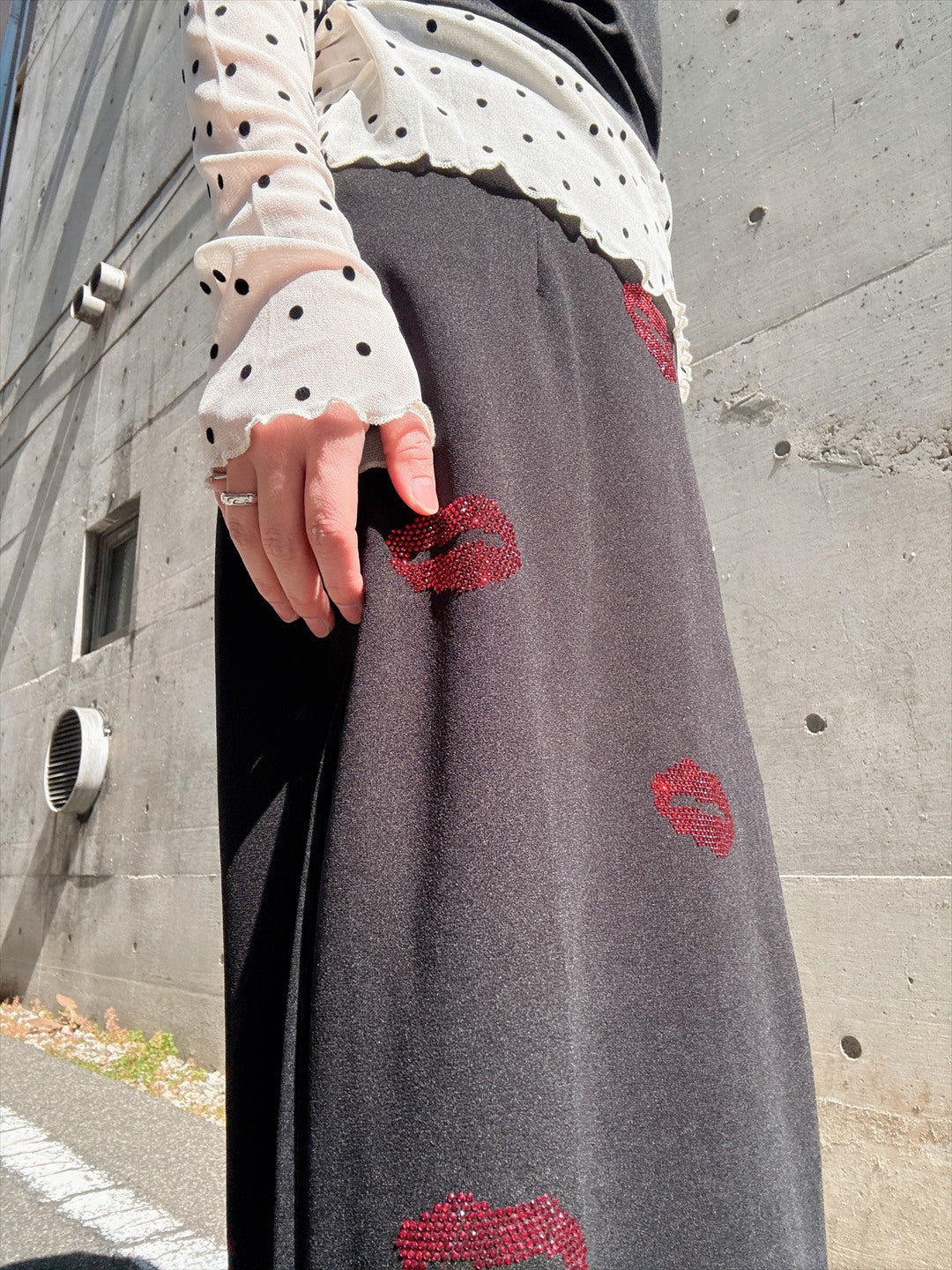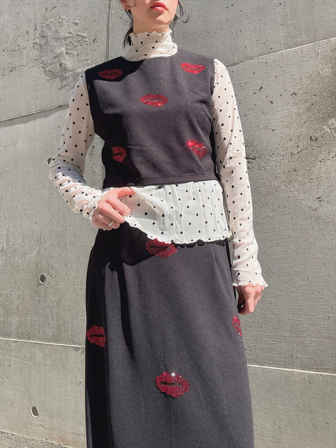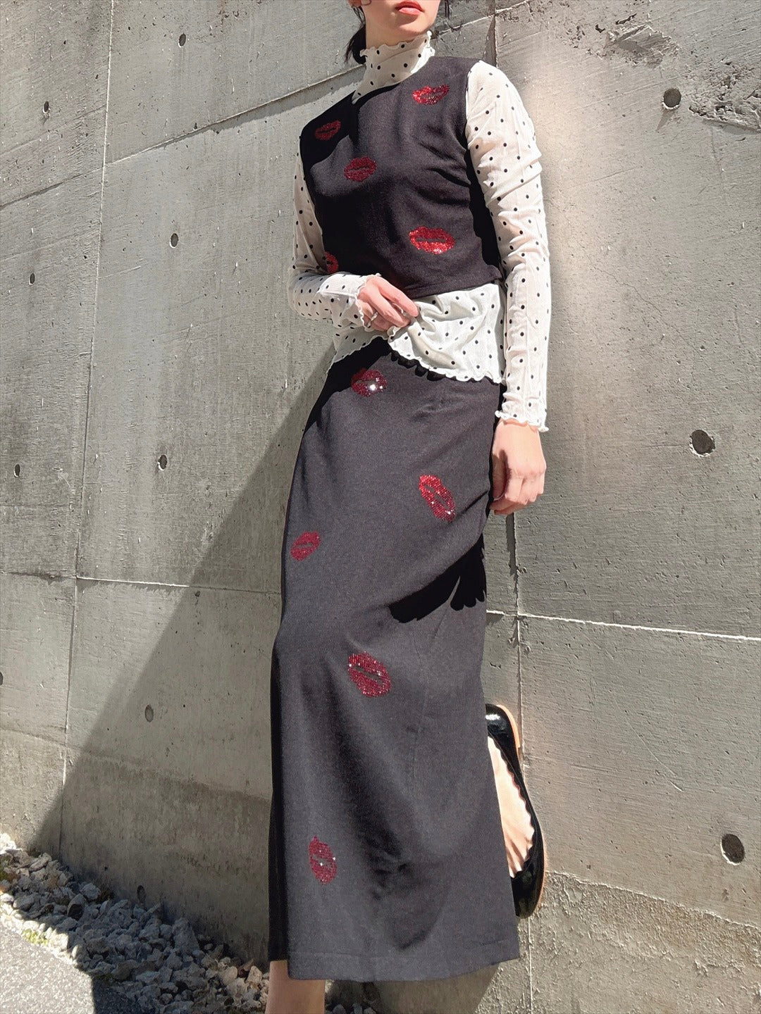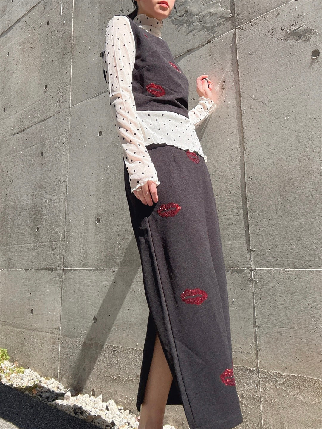 リップ型のラインストーンがキラキラ輝くセットアップ。上下ともにシルエットがキレイで、トップスが少し短めなのがスタイルアップのポイント。バラバラでも使えるので着回しが効く商品です。