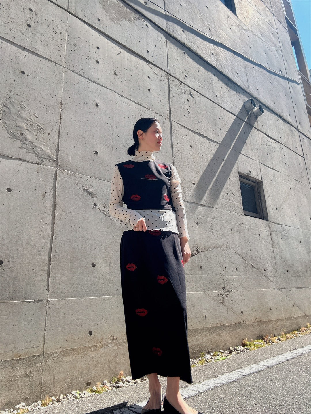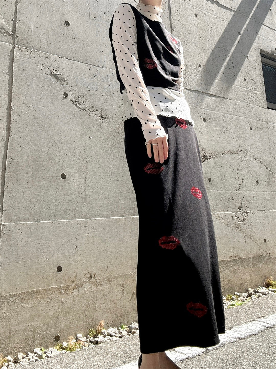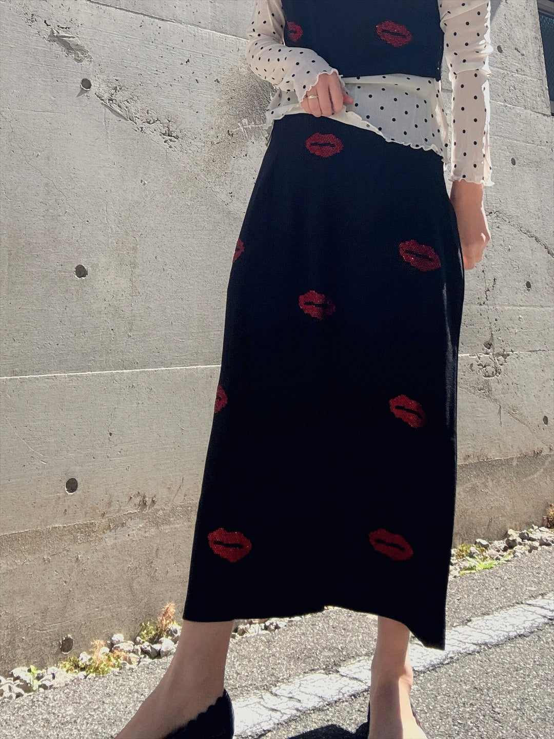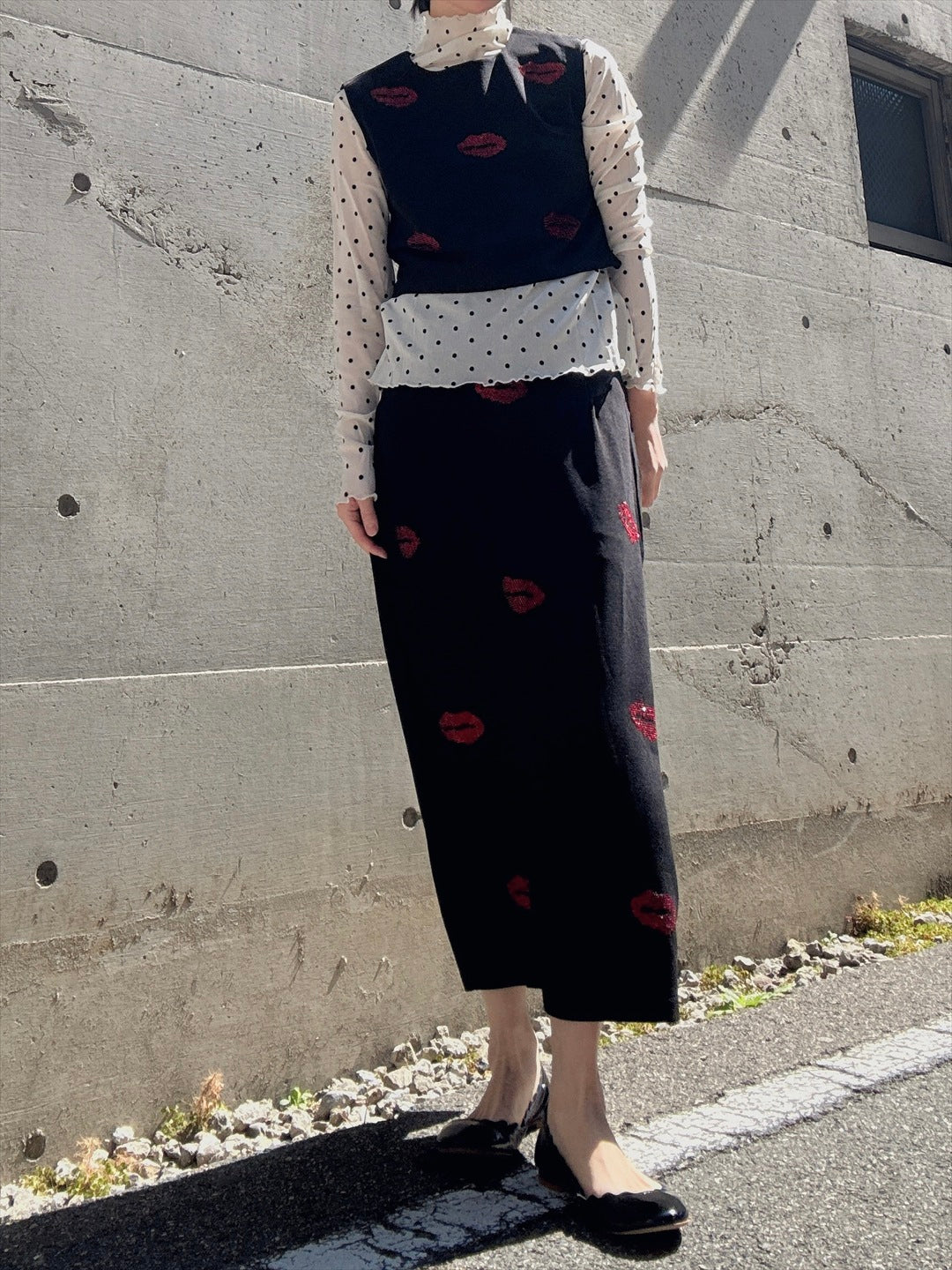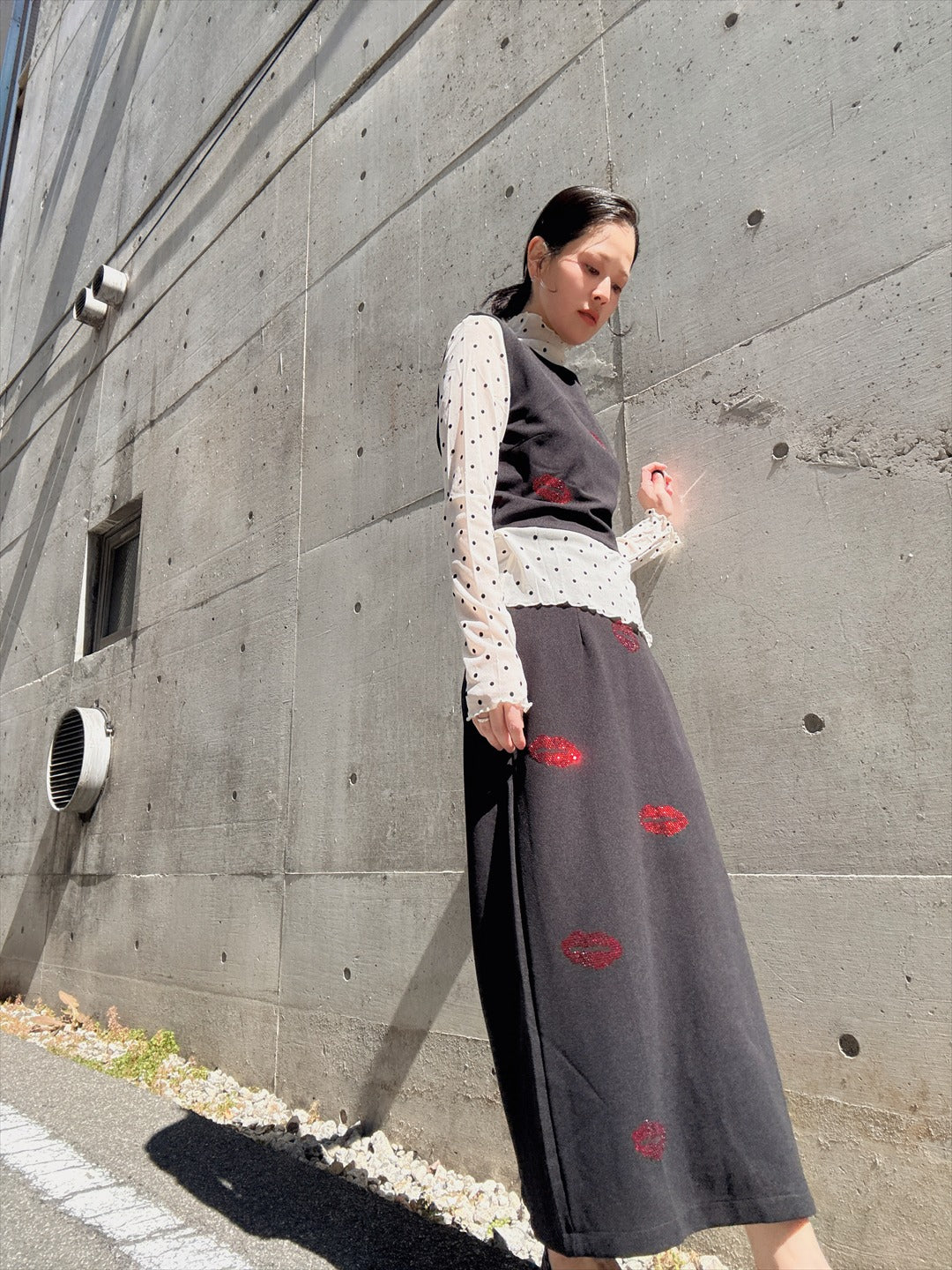 リップ型のラインストーンがキラキラ輝くセットアップ。上下ともにシルエットがキレイで、トップスが少し短めなのがスタイルアップのポイント。バラバラでも使えるので着回しが効く商品です。