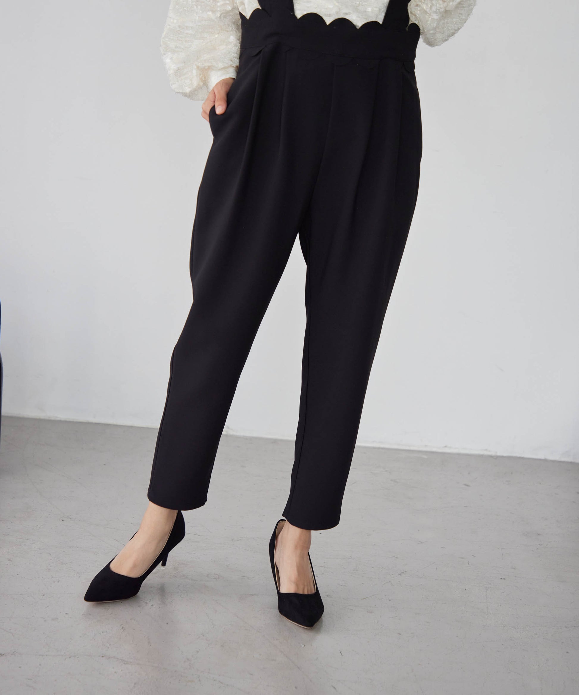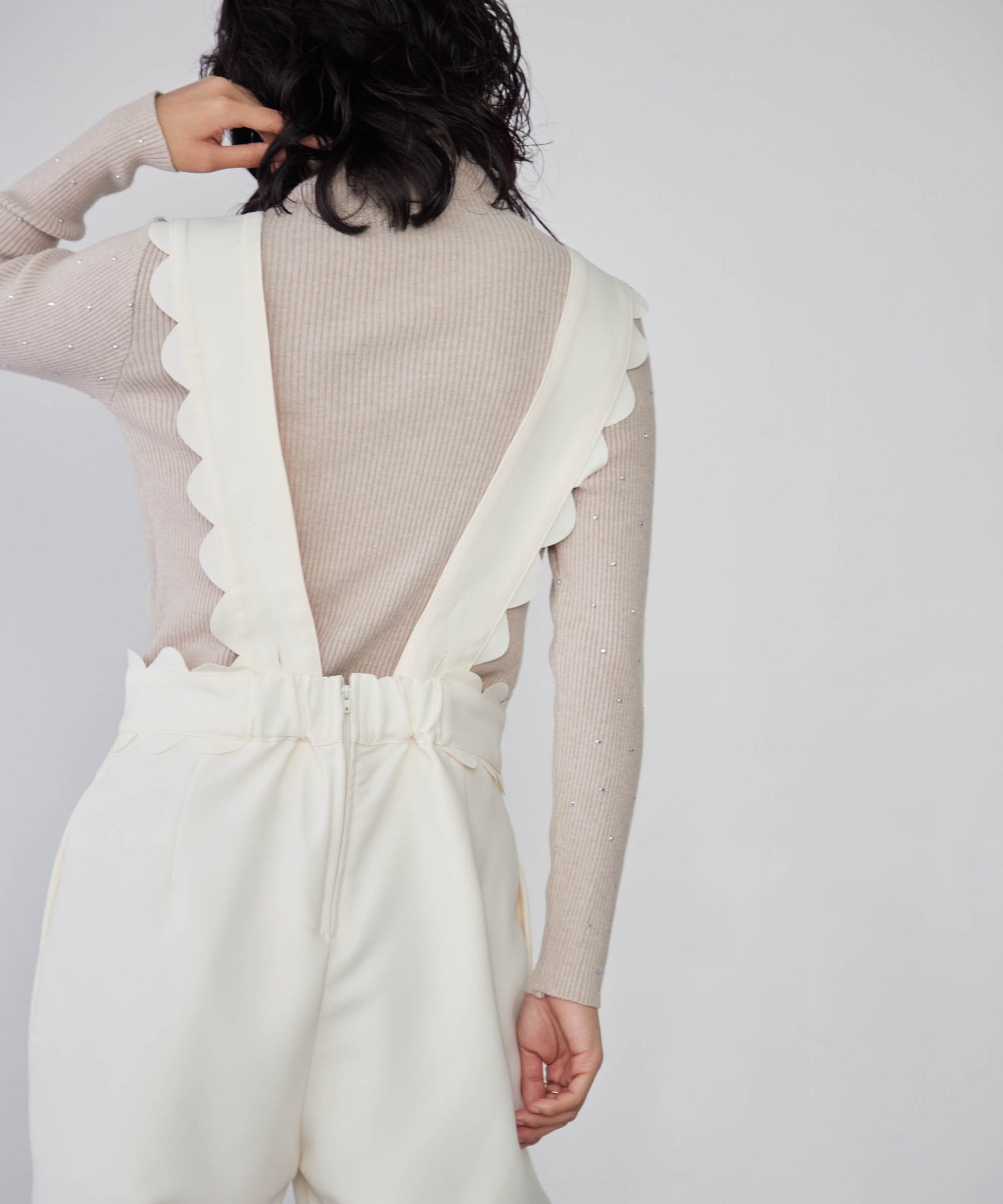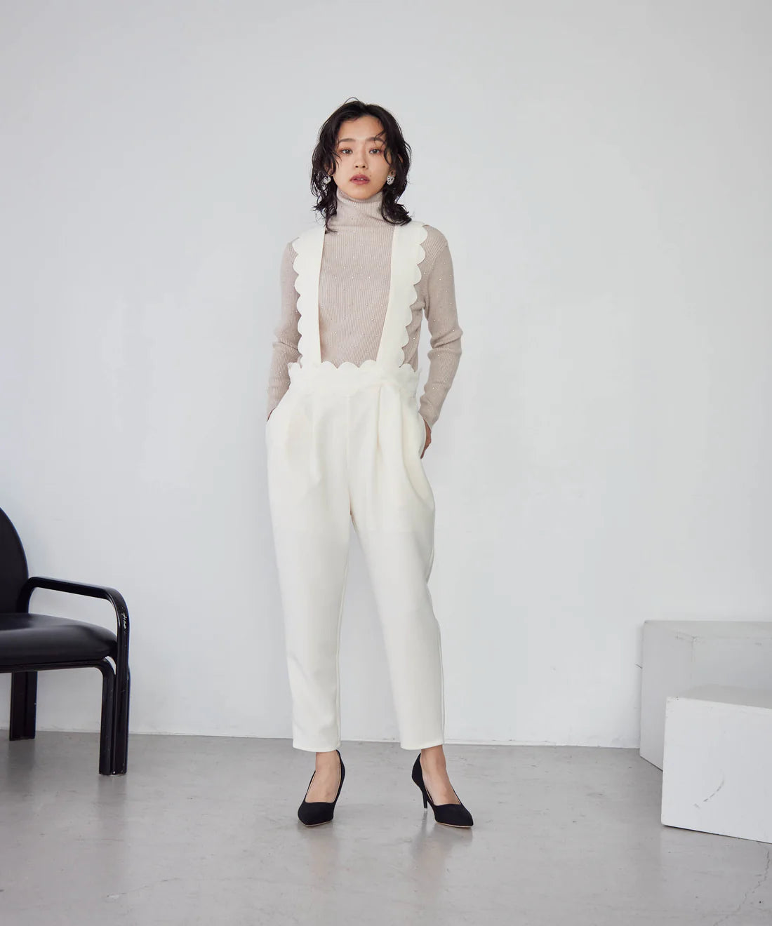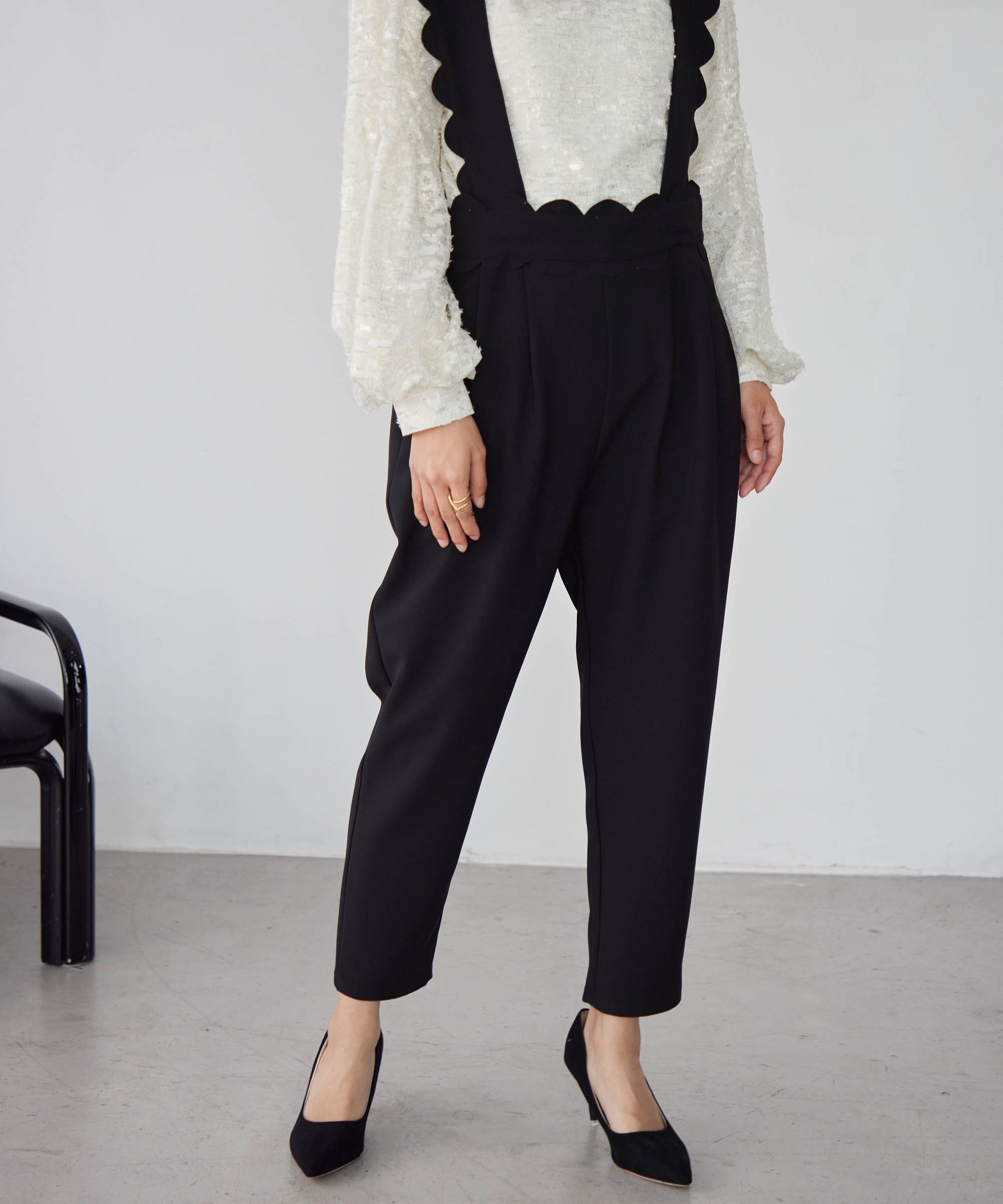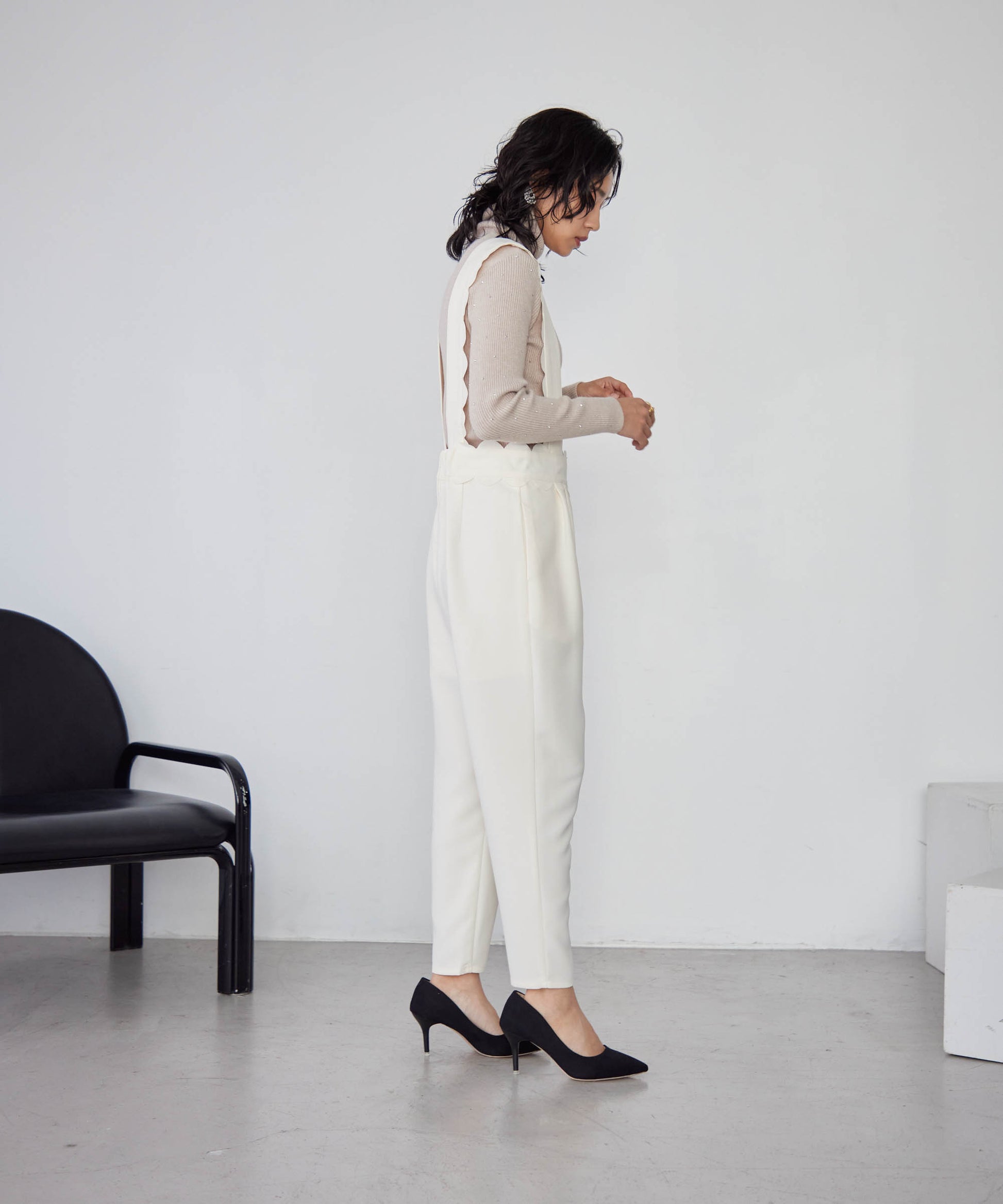 ブラックとアイボリーの2色展開の2WAYスカラップパンツ。特徴的なサス部分に施されたスカラップデザインが女性らしさを引き立て、取り外し可能な設計により、サロペットとしても、シンプルなパンツとしても楽しめる多機能性を持っています。柔らかな素材感と独自のデザインが、様々なコーディネートを格上げするアイテム。