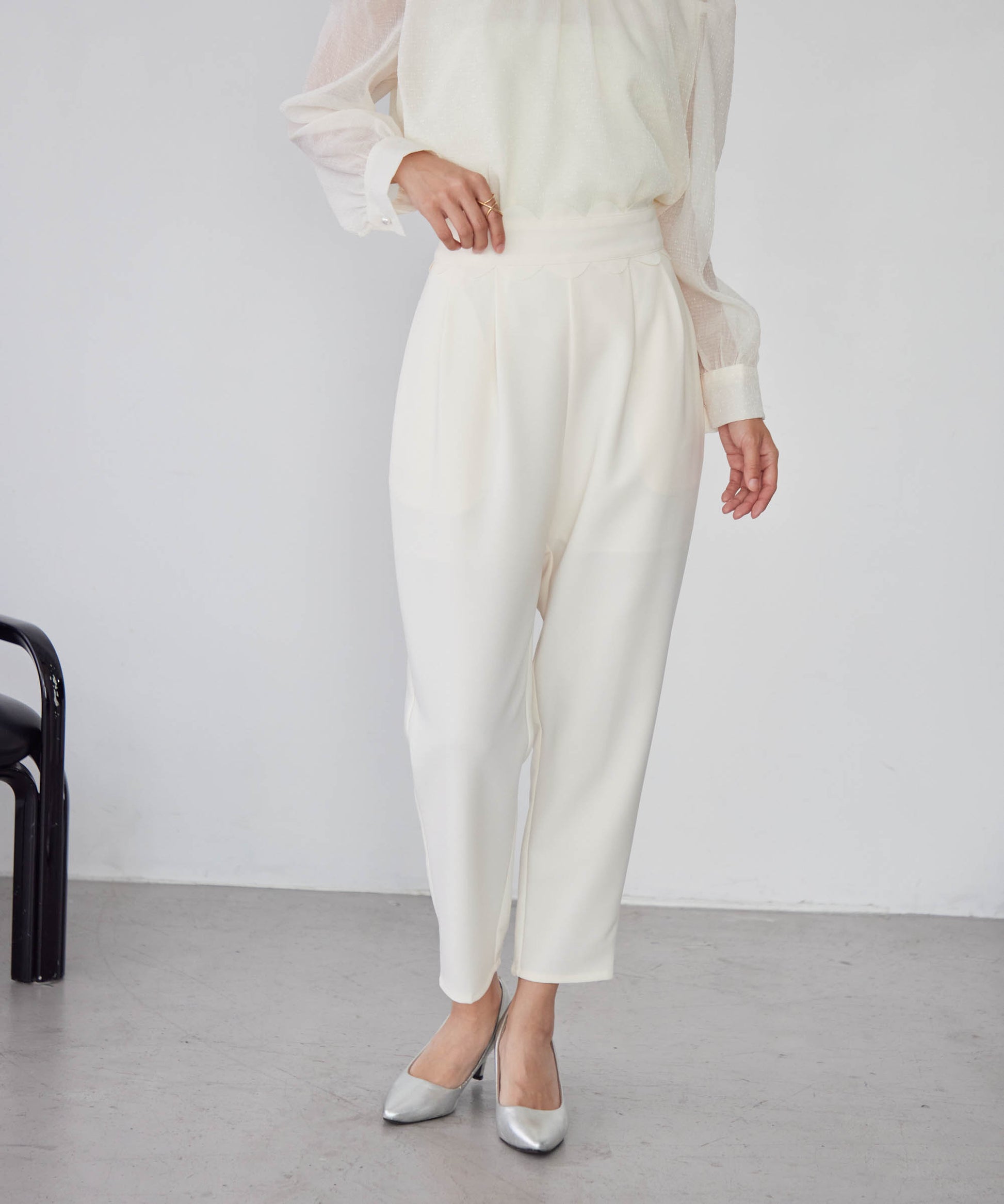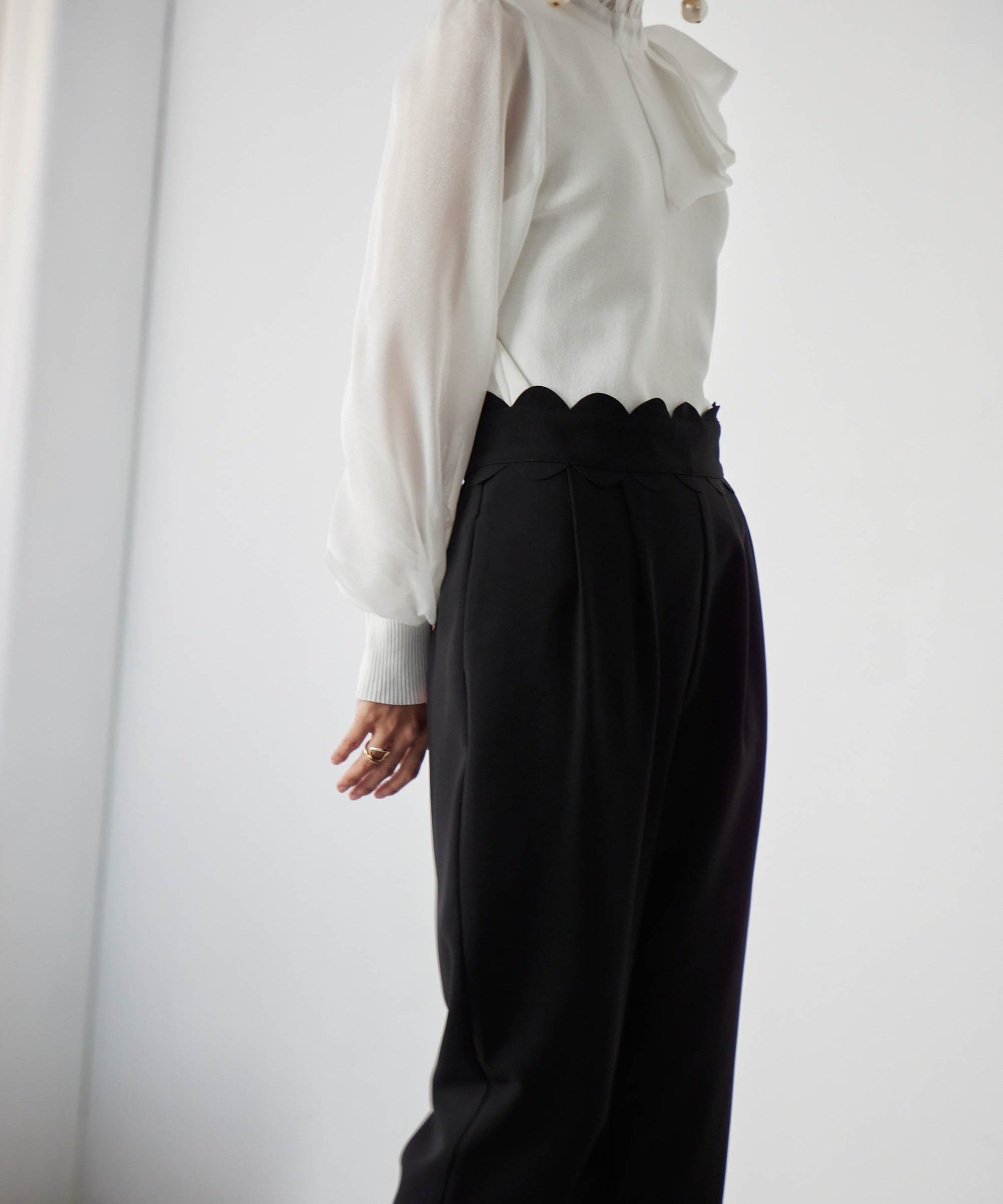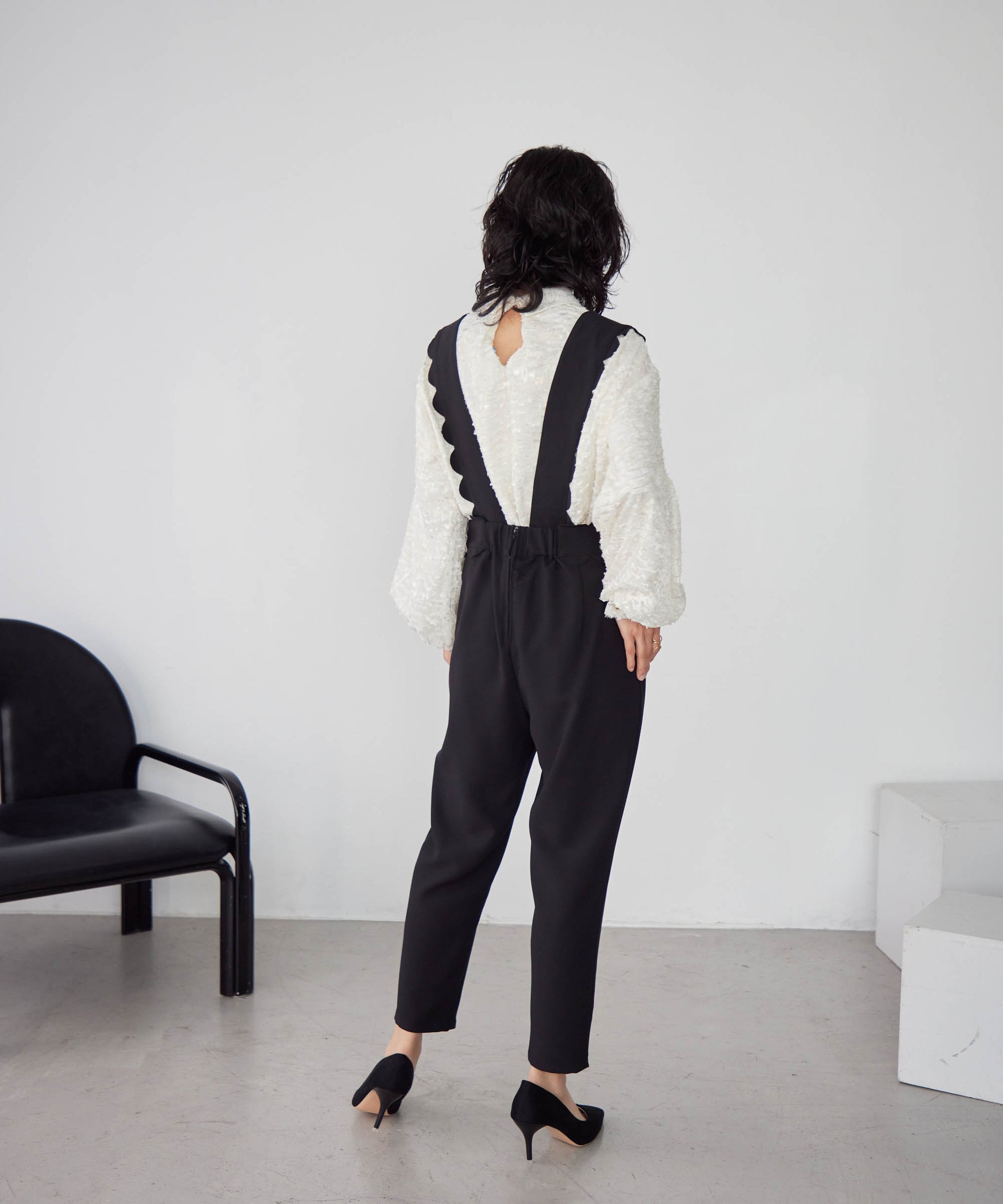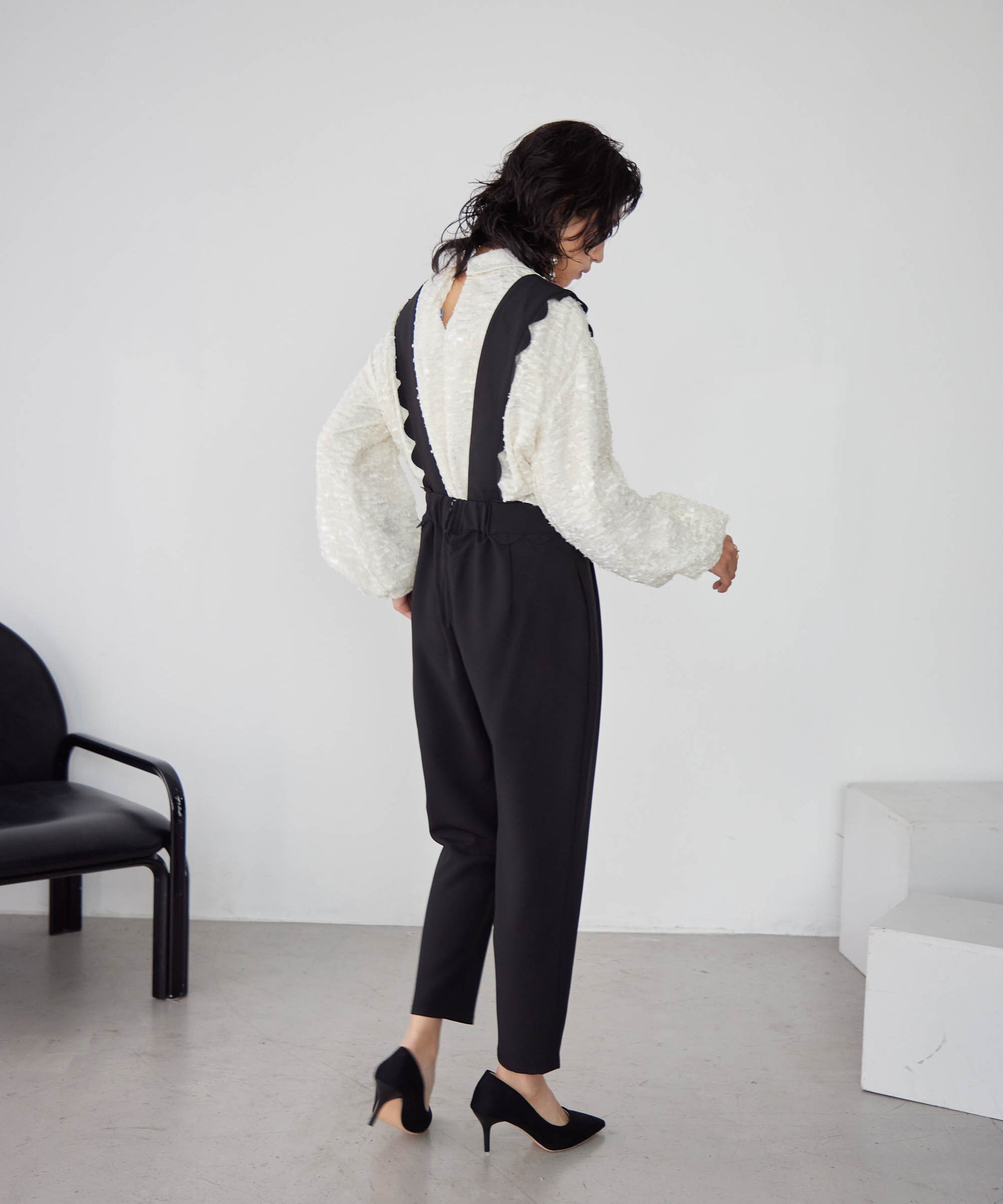 ブラックとアイボリーの2色展開の2WAYスカラップパンツ。特徴的なサス部分に施されたスカラップデザインが女性らしさを引き立て、取り外し可能な設計により、サロペットとしても、シンプルなパンツとしても楽しめる多機能性を持っています。柔らかな素材感と独自のデザインが、様々なコーディネートを格上げするアイテム。