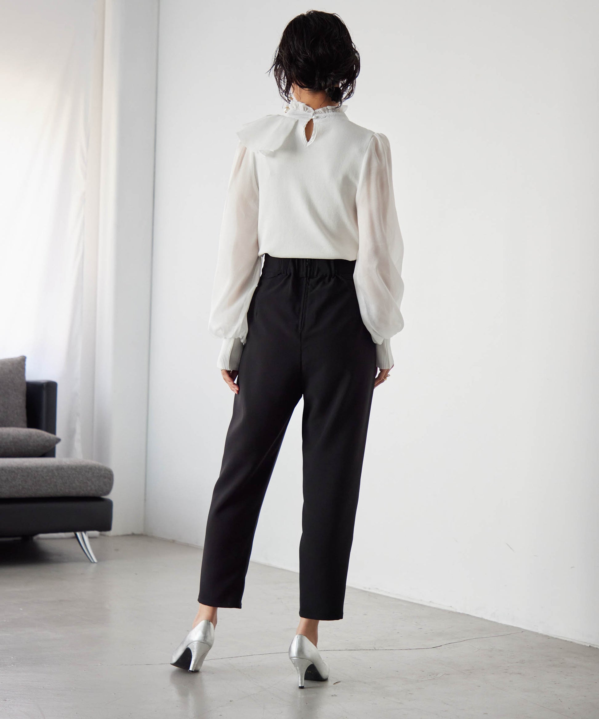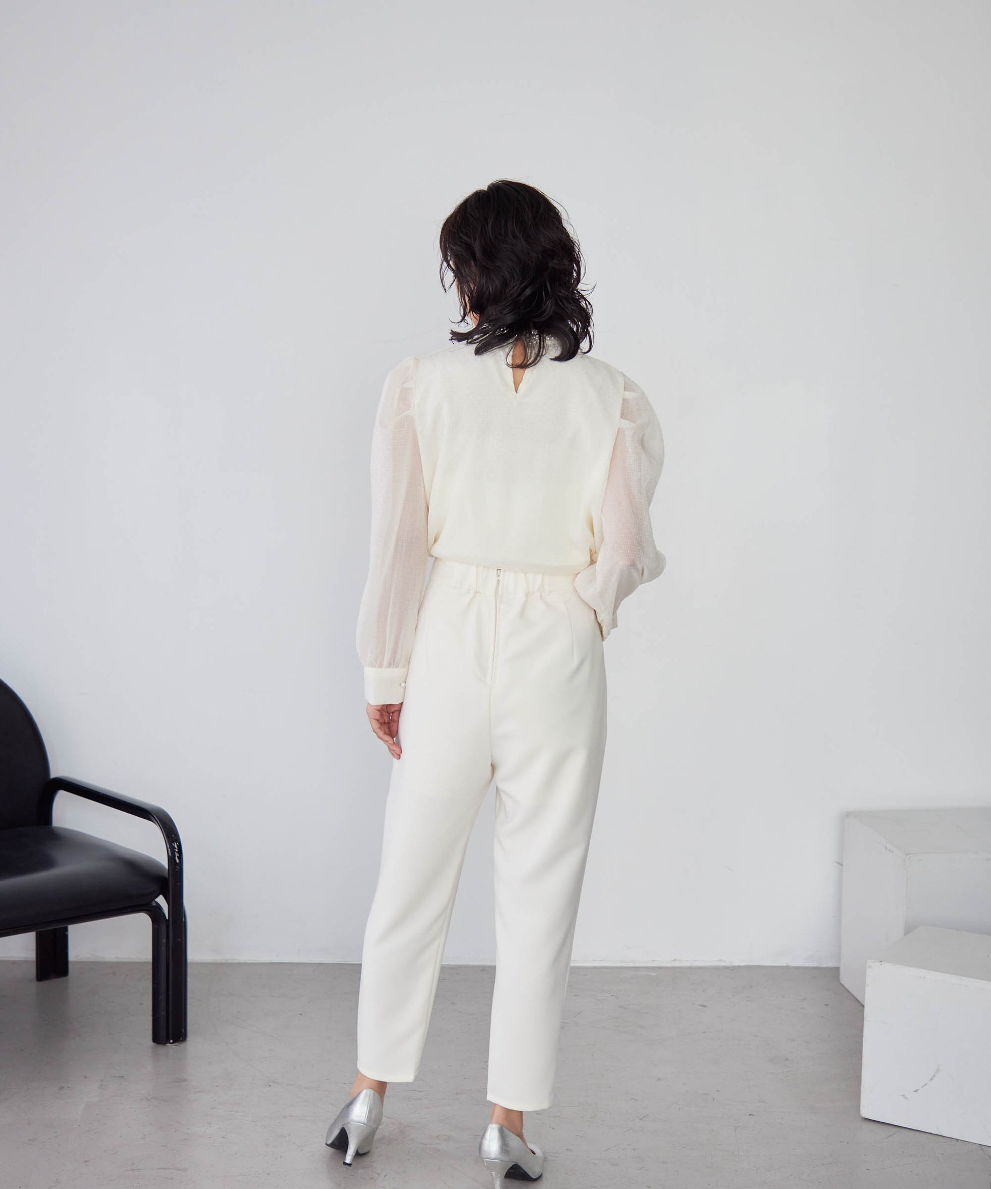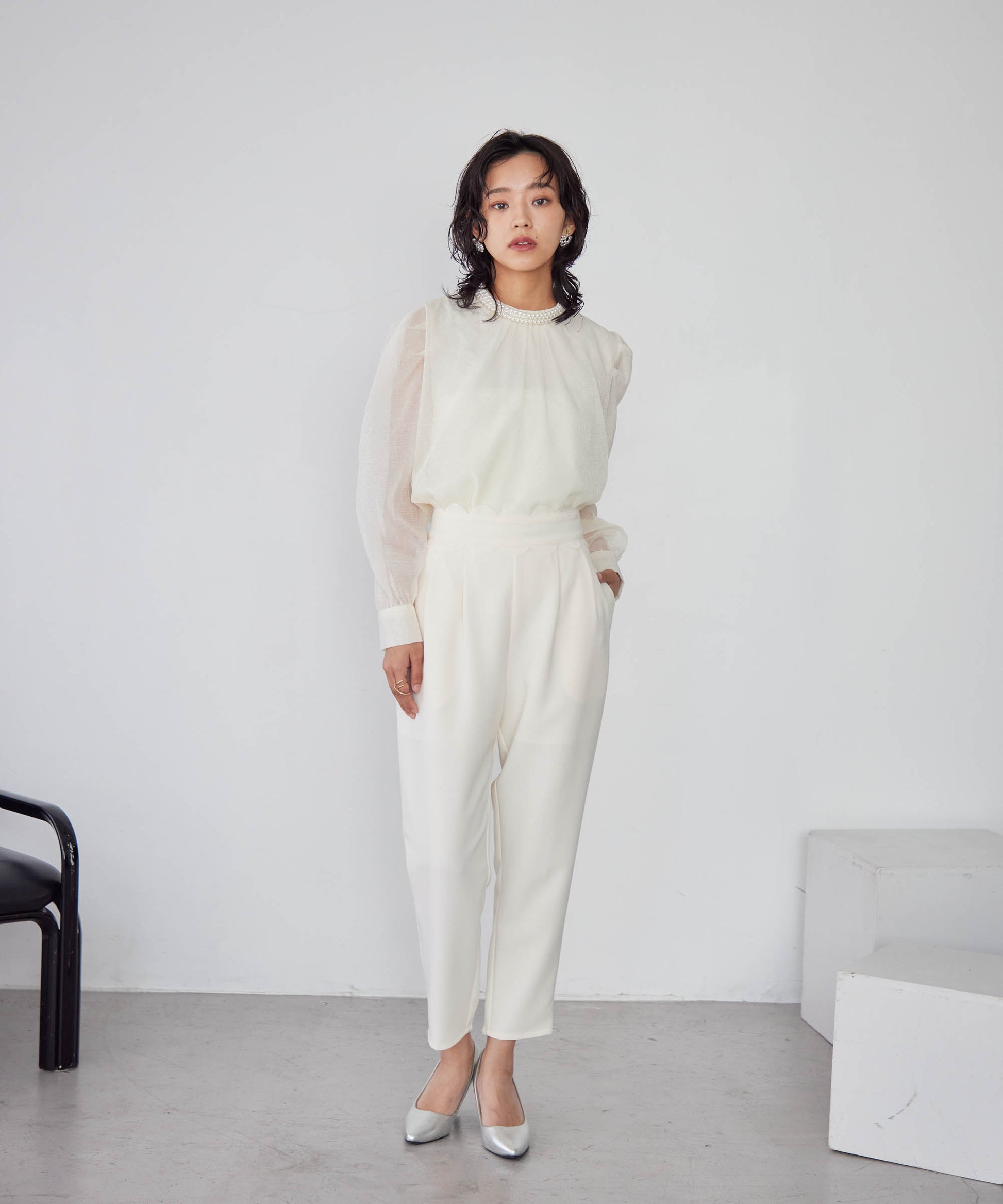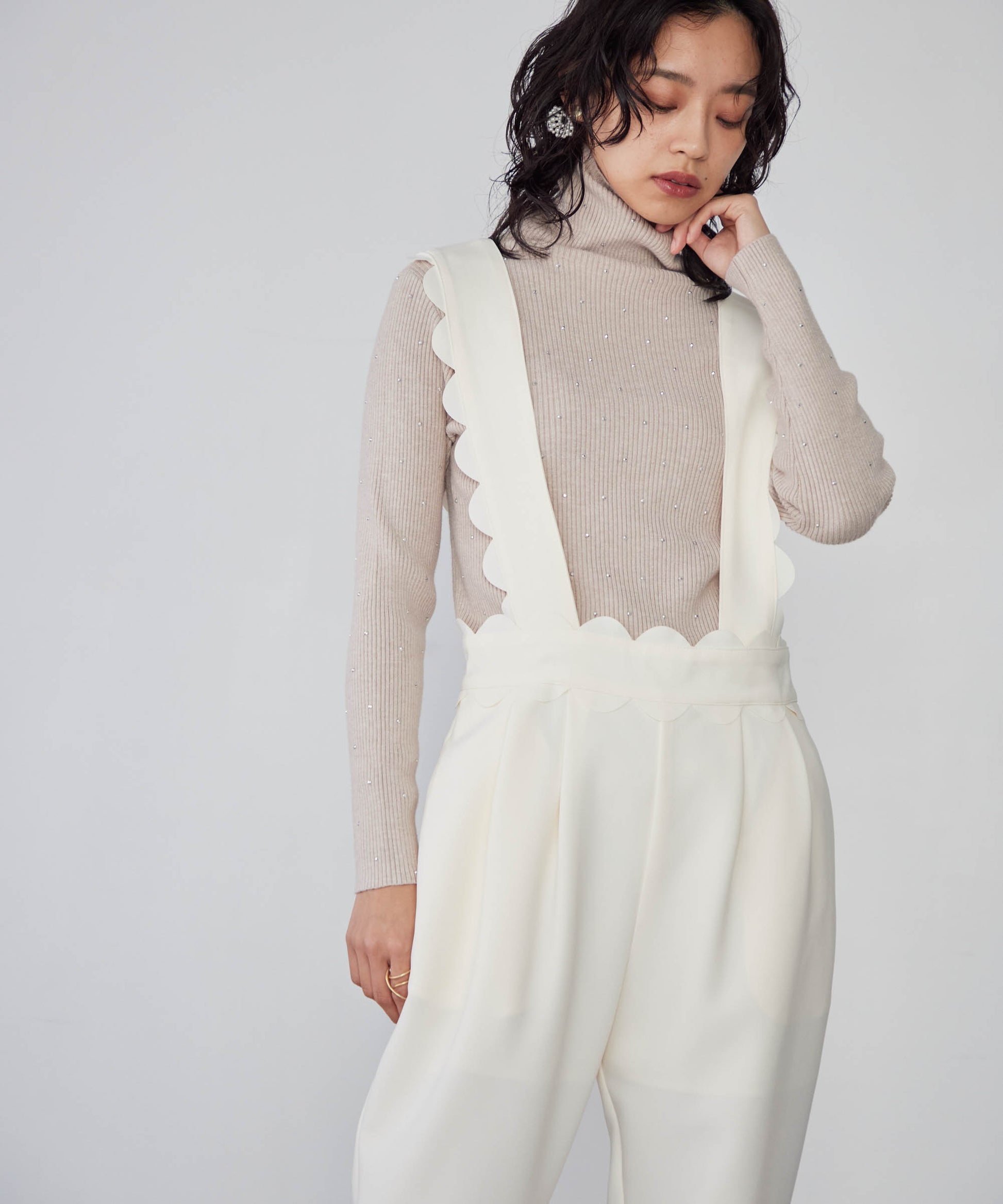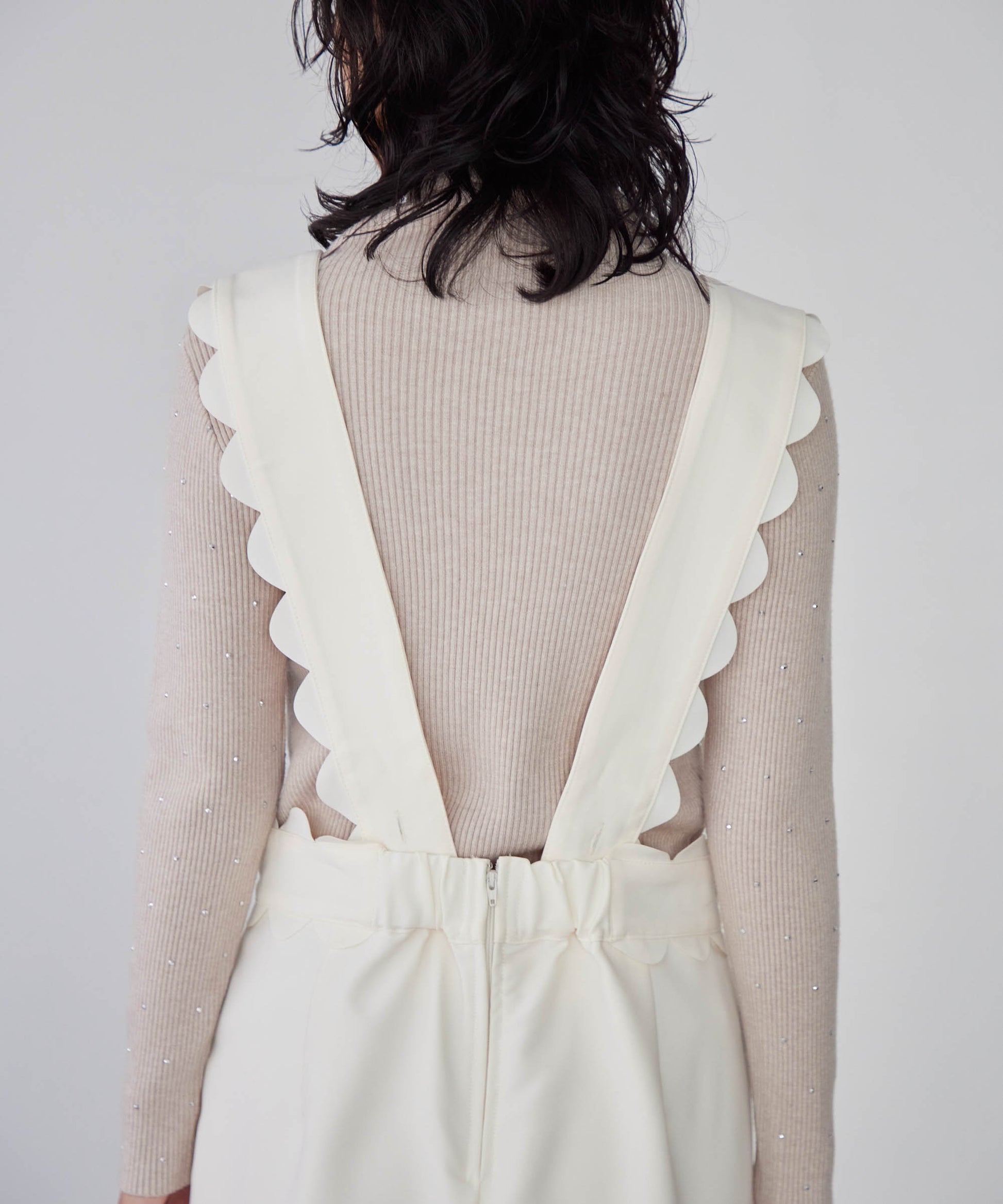 ブラックとアイボリーの2色展開の2WAYスカラップパンツ。特徴的なサス部分に施されたスカラップデザインが女性らしさを引き立て、取り外し可能な設計により、サロペットとしても、シンプルなパンツとしても楽しめる多機能性を持っています。柔らかな素材感と独自のデザインが、様々なコーディネートを格上げするアイテム。