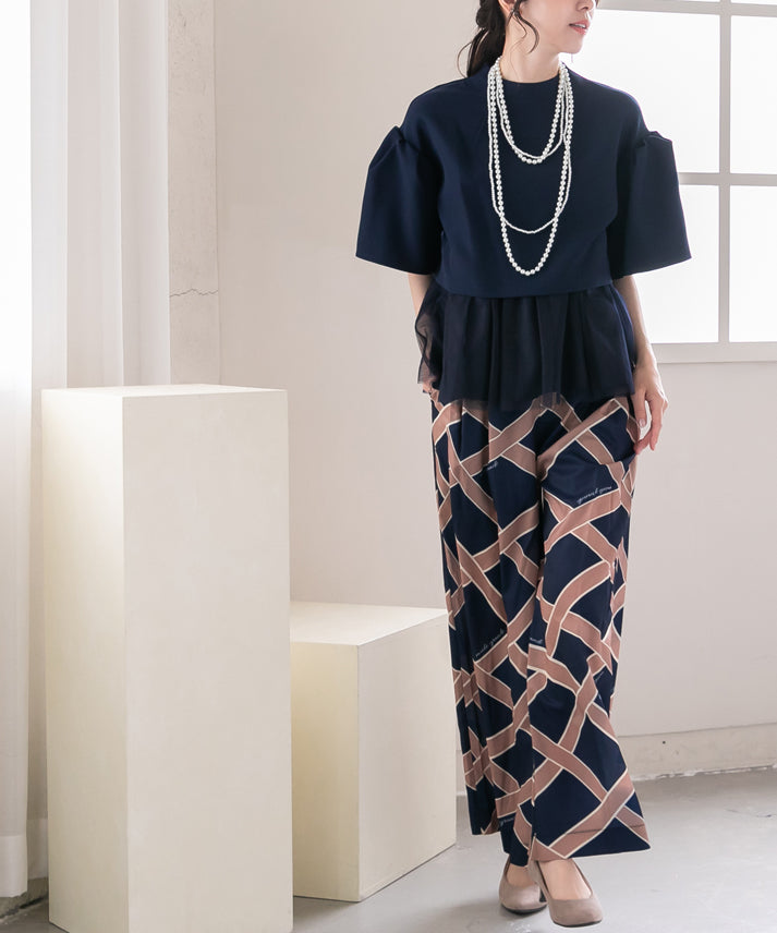 袖のバルーンデザインとチュールのレイヤードが特徴的なデザイン。着るだけで女性らしさを引き立てます。中のチュールキャミソールは単体でも使用可能で、コーディネートの幅を広げます。デニムやショートパンツなどシンプルなボトムと合わせれば華やかな印象を与え、柄パンツにはコーデのバランスをとりながら、アクセントになってくれる万能アイテム。