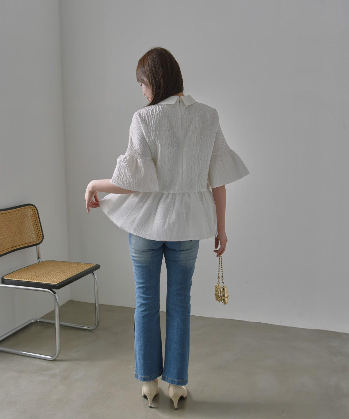エレガントな魅力をだす、ジャガード素材のペプラムブラウス。白と黒の2つのカラーバリエーションで、洗練されたスタイルを演出します。チュールがアクセントの袖と裾にボリュームを添え、女性らしい柔らかな動きを生み出します。ジャガード素材の緻密な模様が高級感を醸し出し、装いに深みを与えます。ウエストのペプラムデザインがシルエットを引き締め、自然なフェミニンラインを描きます。特別な日から普段使いまで、存在感のあるアイテムで魅力的なスタイリングを完成させましょう