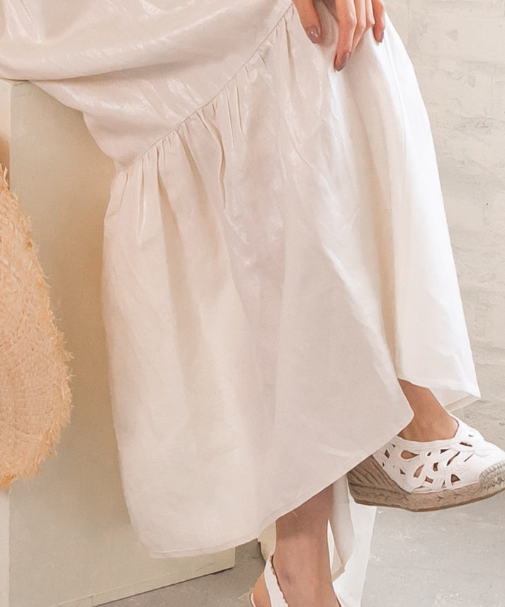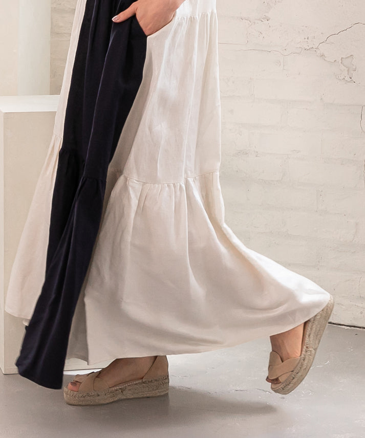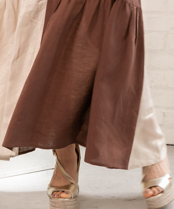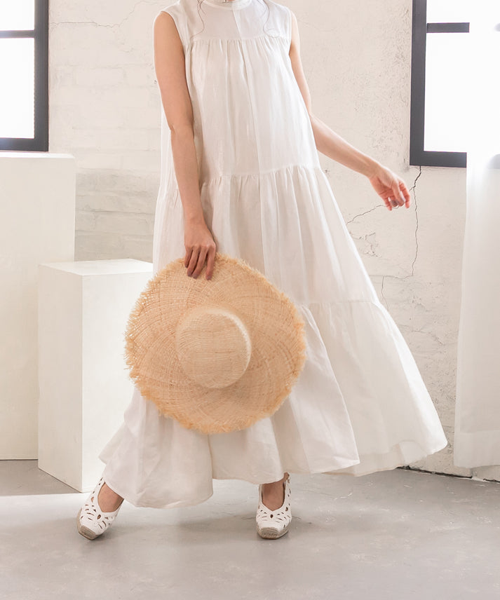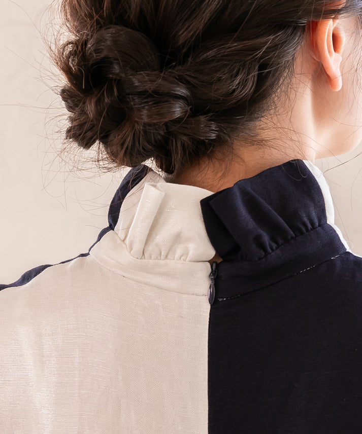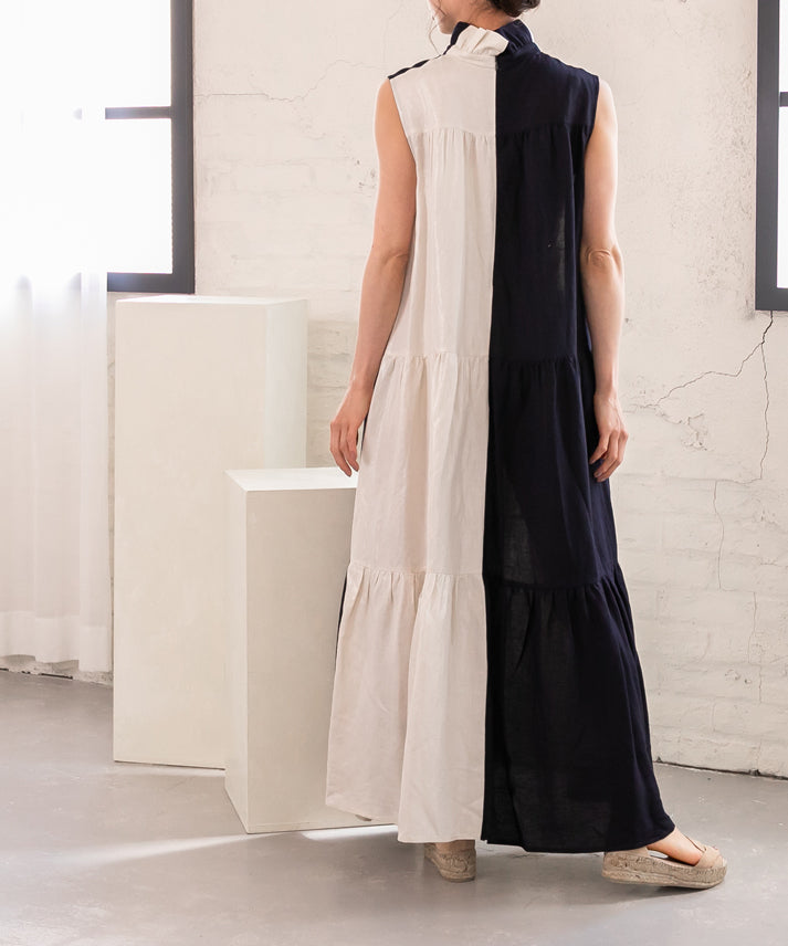 光の反射によって豊かな表情を魅せるロングワンピース。光沢感が上品かつエレガントな印象を強調し、着るだけで存在感を際立たせます。ナチュラルな色味と深みのあるカラーブロックの組み合わせが、シックで洗練された雰囲気を引き立てるデザイン。ハイネックとノースリーブの組み合わせがスタイリッシュで、1枚で主役になれるシンプルながら印象的なデザインです。