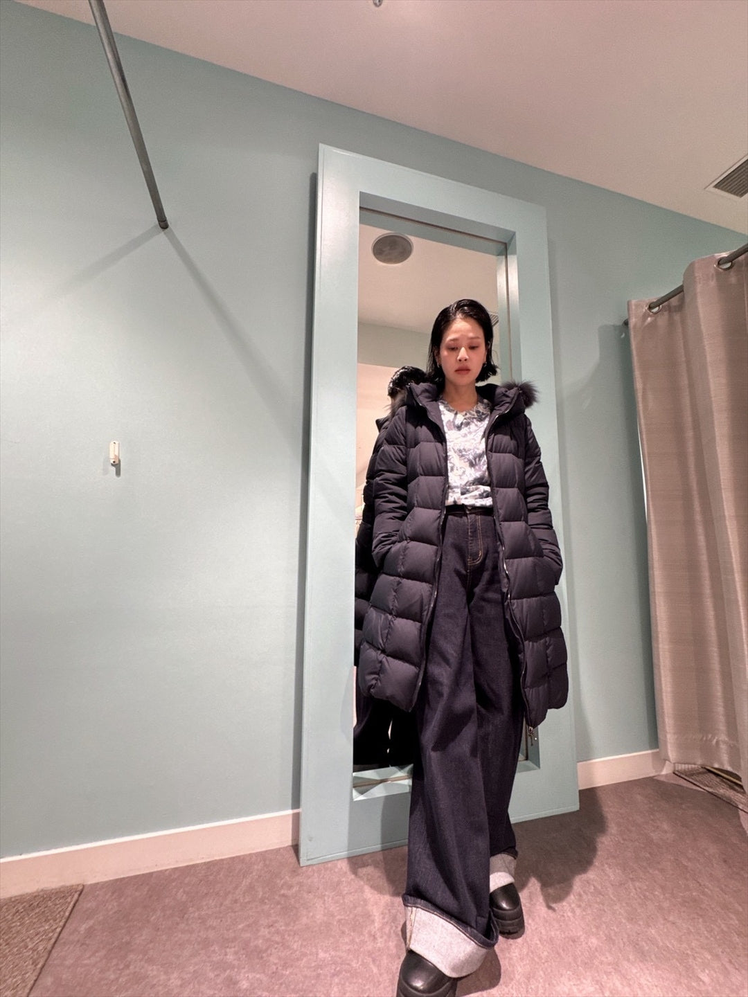 体のラインに沿う、ブロックステッチが印象的なロング丈ダウンジャケット。