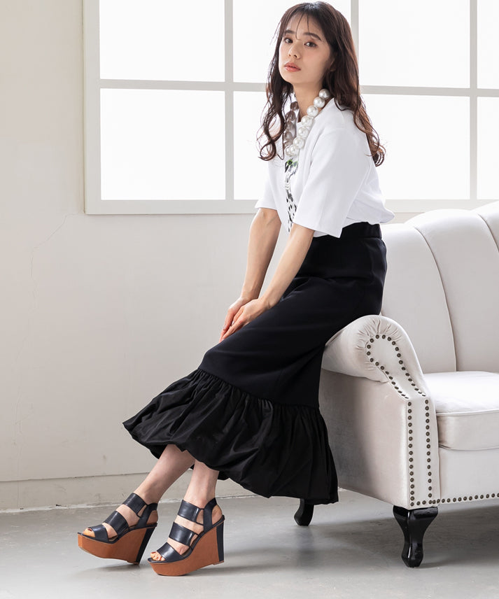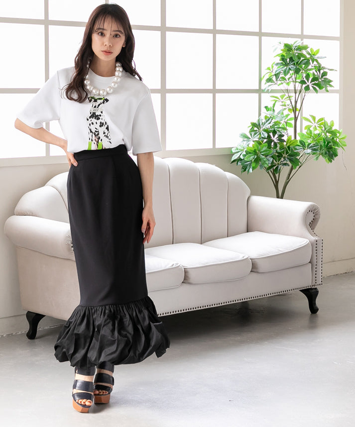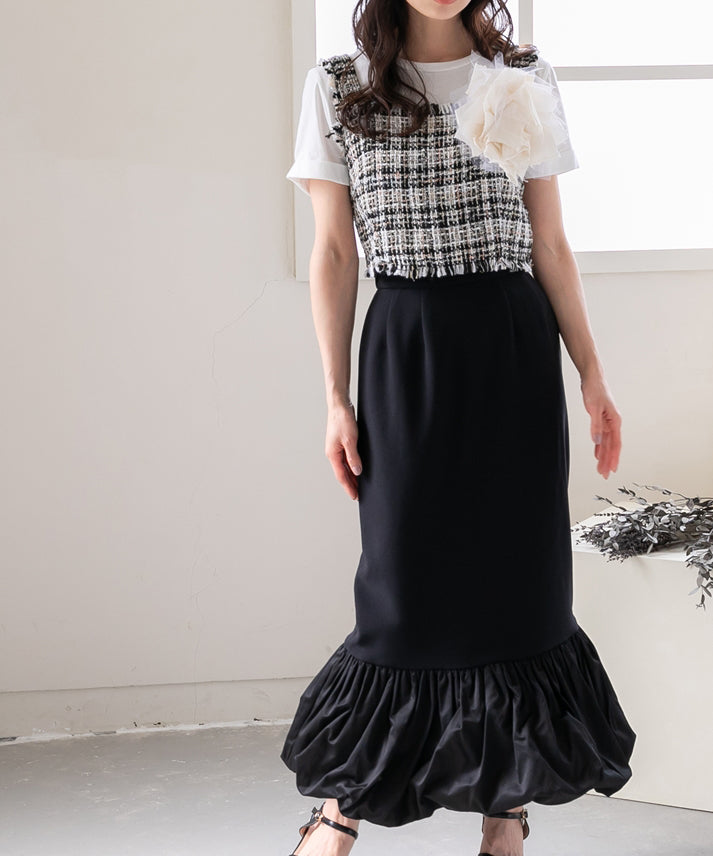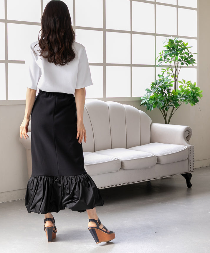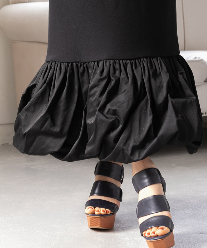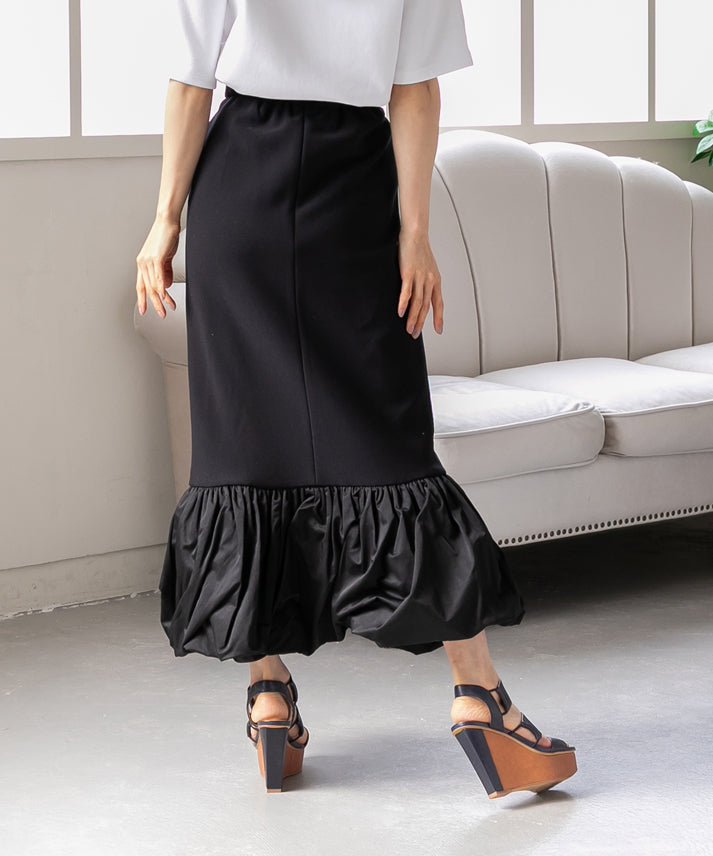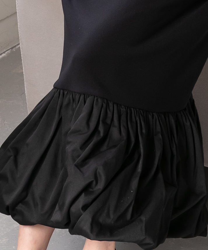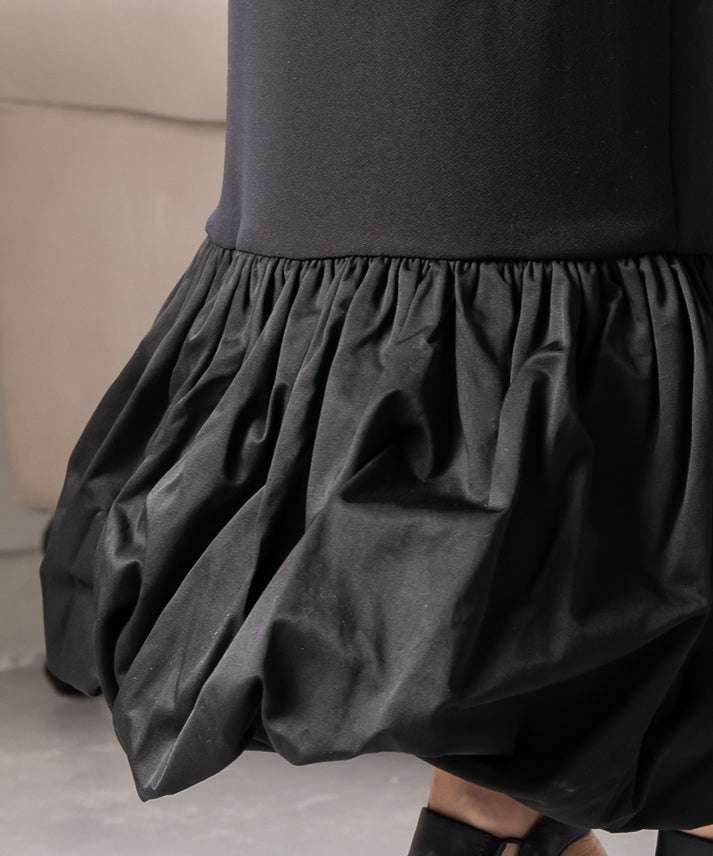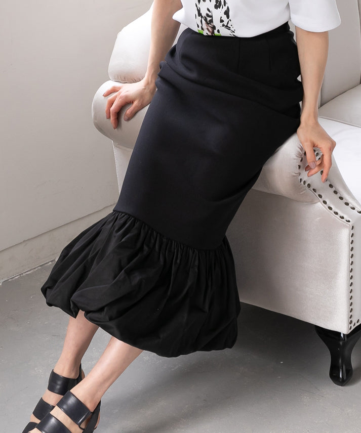 エレガントな裾バルーンデザインが特徴のマーメイドスカート。上品なブラック生地から切り替わるバルーン部分が他とは一線を画す洗練されたアイテムです。バルーン部分にはハリのある素材を使用しており、立体的なデザインをキープします。マーメイドカットが女性らしさを強調しつつ、ギャザー入りのバルーン裾が個性的なアクセントを加え、どんなシーンでも映える主役アイテムです。