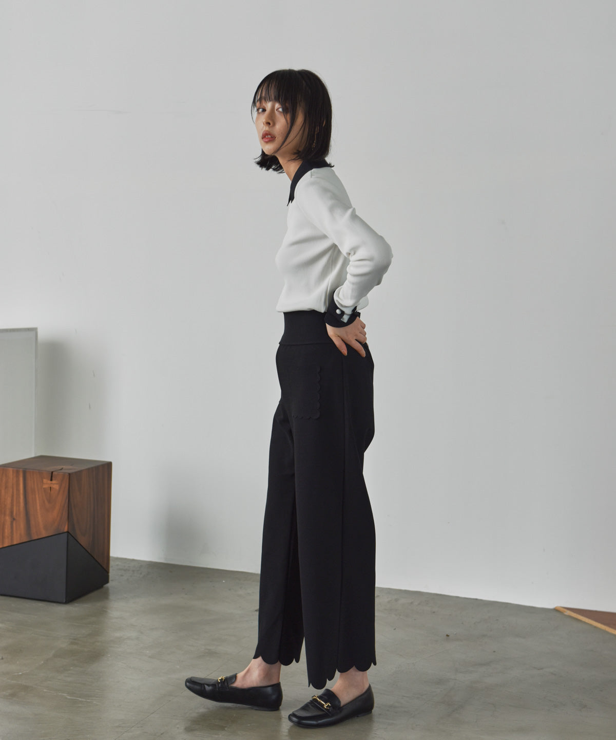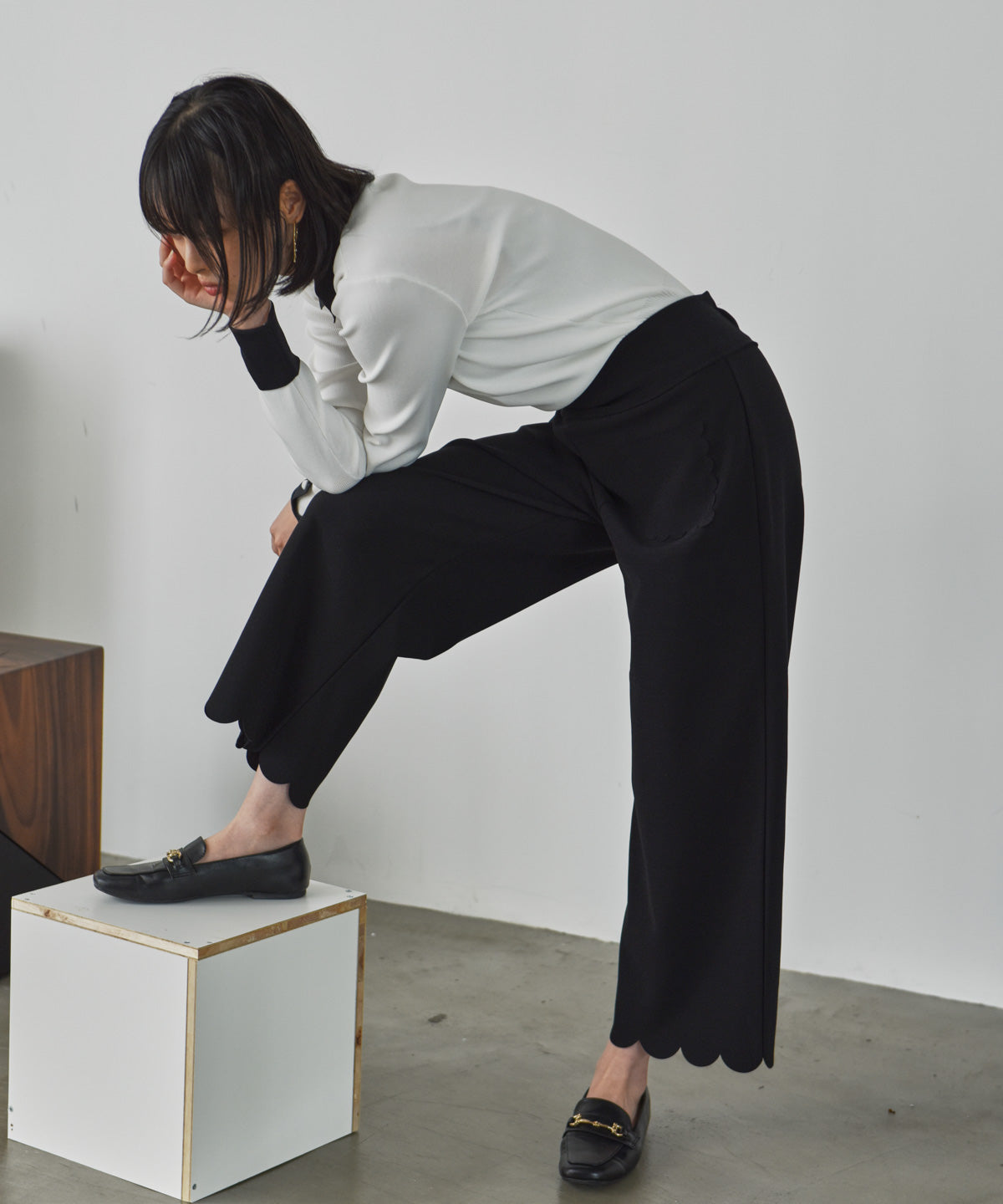 繊細なスカラップデザインが施された裾とポケットが魅力のレディースパンツ。その独特のデザインが、シンプルながらも個性的なスタイリングを叶えます。スカラップのエレガントなカーブが女性らしさを引き立て、どんなトップスとも調和する優れた着まわし力が魅力です。トレンドとクラシックが融合したデザインで、ファッションの幅を広げるアイテムです。