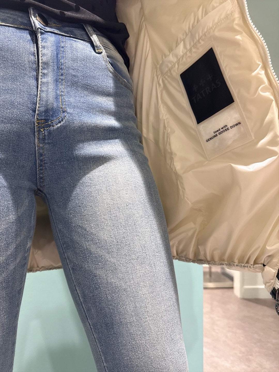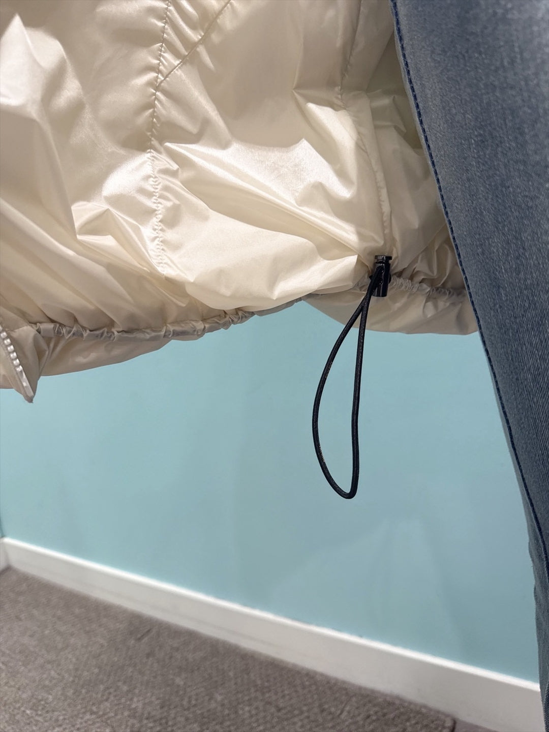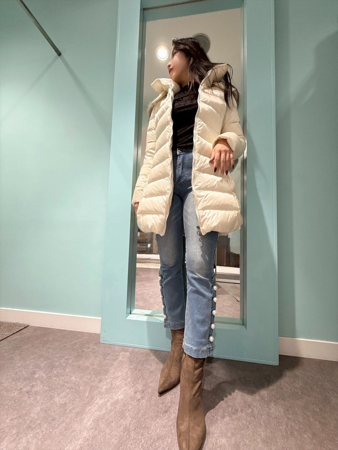 ウエストを絞った上品なシルエットが印象的なミドル丈のダウンコート。