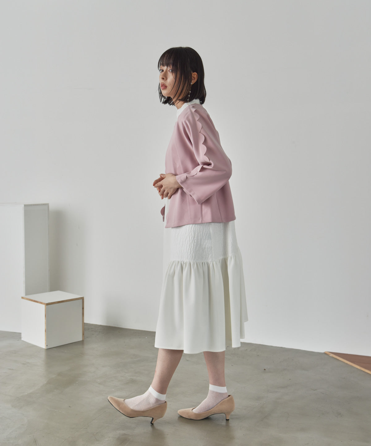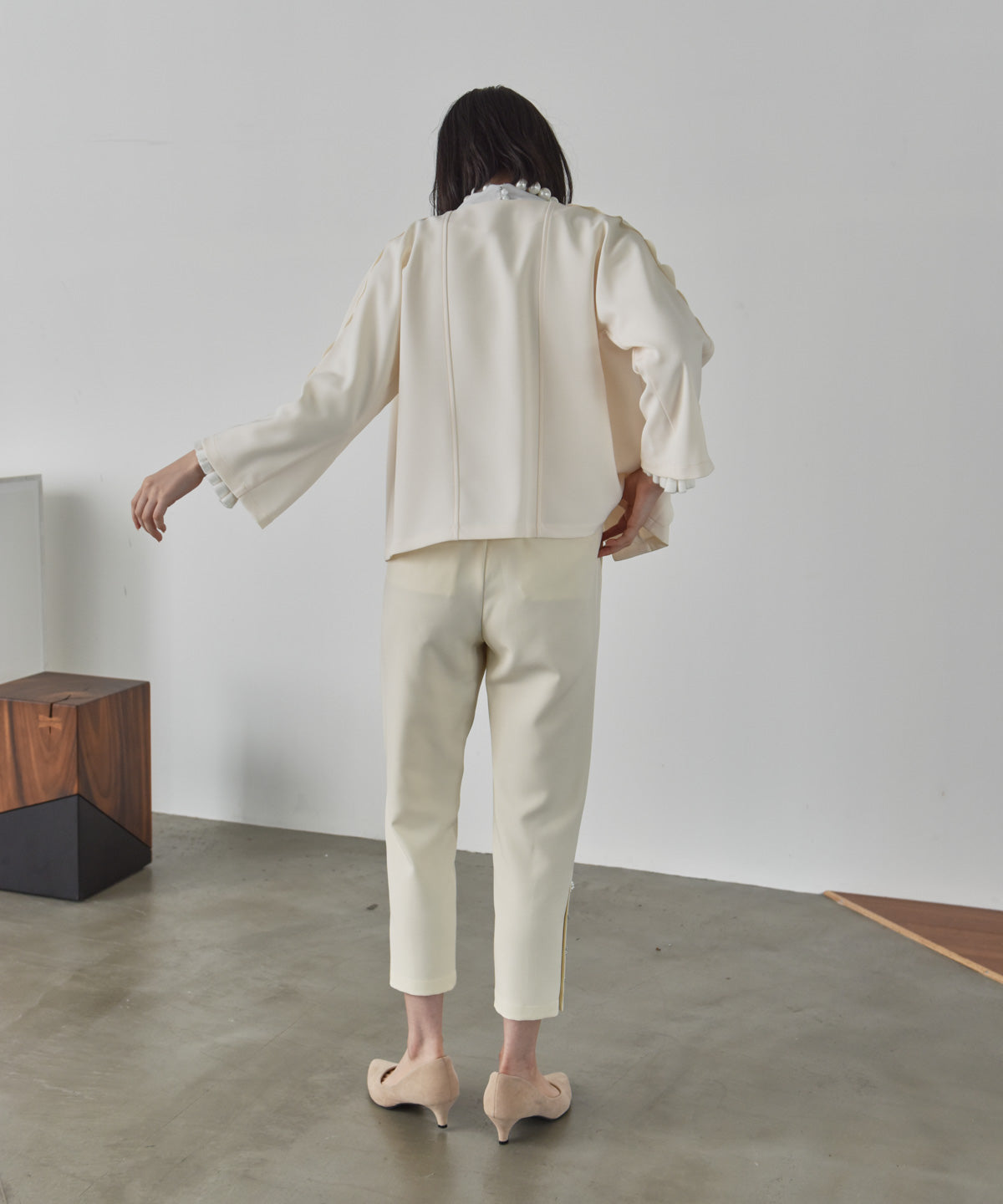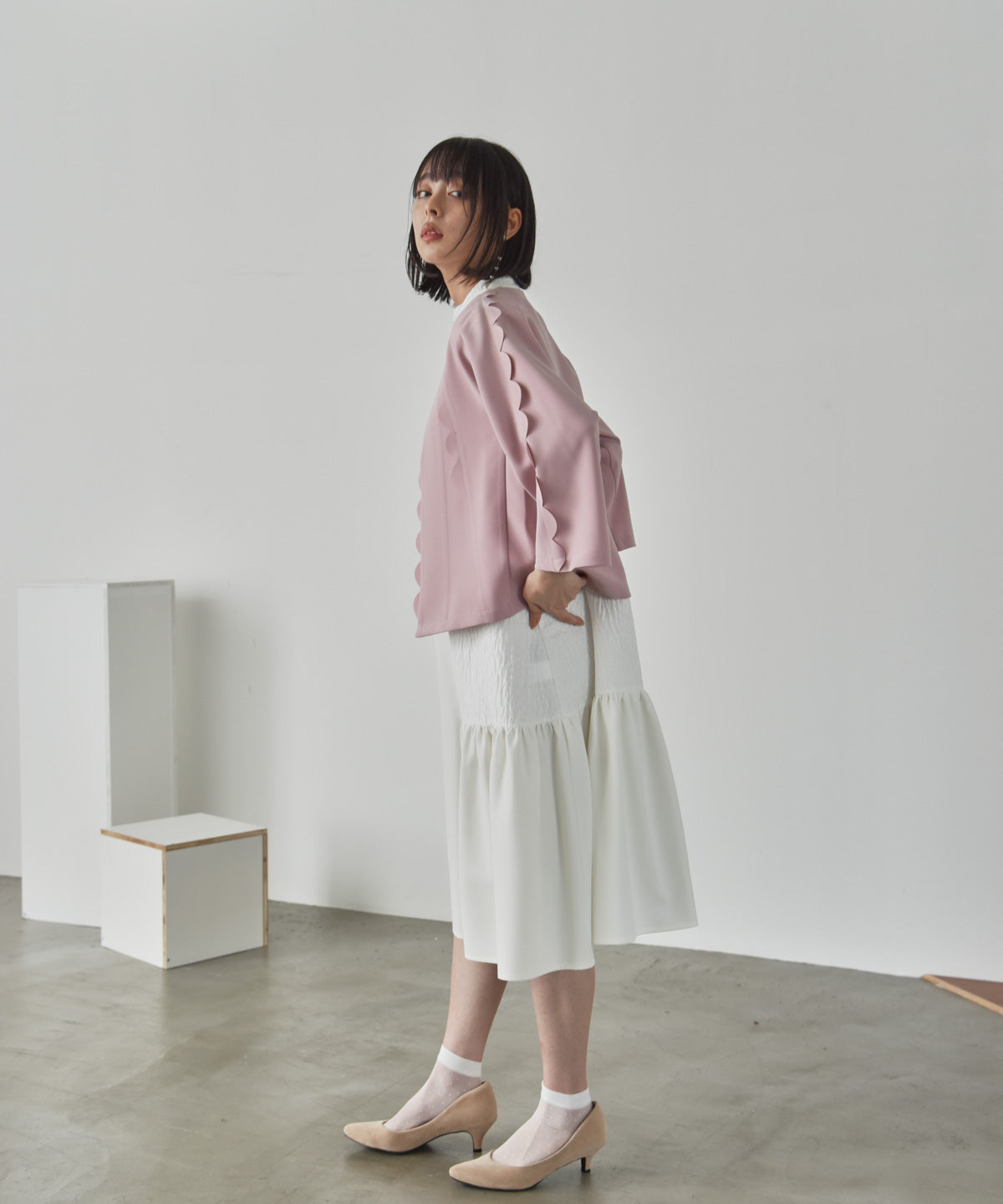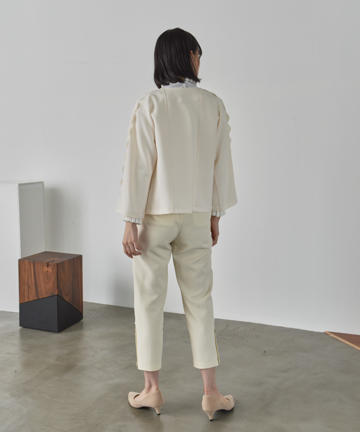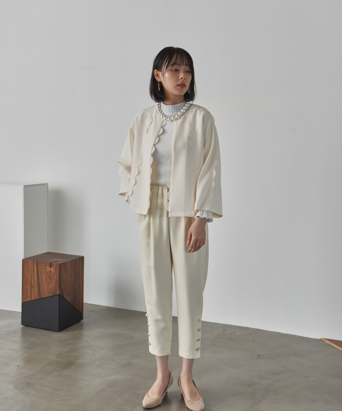 上品な装いを叶える、袖にスカラップデザインが施されたジャケットが登場しました。