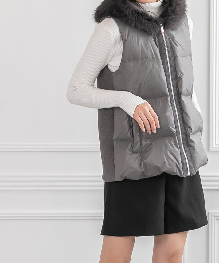 秋冬のコーディネートにあると着回しが効くダウンベスト。シンプルなコーディネートでどんなスタイルにもマッチします。フードにあしらわれたファーがカジュアルすぎず上品で大人な印象に。 、開けると可動域が広がり動きやすさもアップします。 普段使いからお出かけまで幅広く活躍し、季節の変わり目にぴったりなアイテムです。