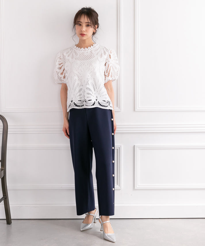 シックなネイビーブルーと洗練されたブラックの2色展開。 サイドに並ぶパールが上品なアクセントを置くパンツです。 リラックスしながらも美しいシルエットを見据えたワイドレッグが、どんなシーンにもマッチします。がキラリと光るディテール。絶妙な位置に配置されたパールが脚線を美しく見せ、スタイリッシュながらも女性らしく優雅さを楽しめます。どんなコーデにもエレガンスを整えて、オフィスからアフターまであらゆるシーンで存在感を放ちます。
