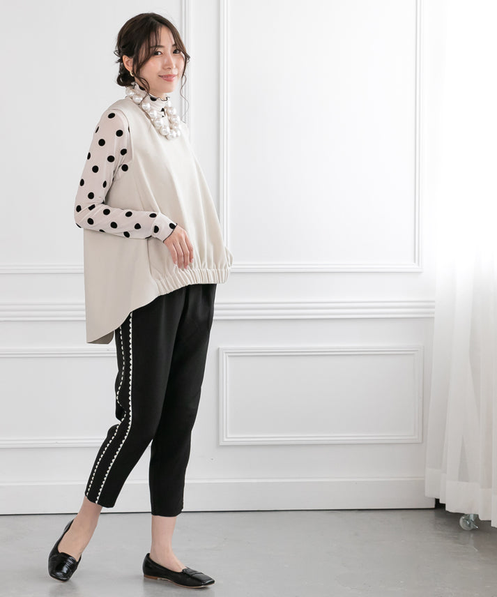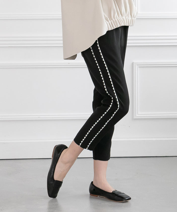 綺麗めスタイルに遊び心をプラスしたデザインが魅力のサイドプチスカラップパンツ。テーパードシルエットが美しいラインを作り出し、サイドに施されたプチスカラップがフェミニンな雰囲気を演出します。ウエストゴムで快適な履き心地と動きやすさを兼ね備え、ポケットも付いて実用的。シンプルなコーディネートにもアクセントとして使え、さりげなくおしゃれを楽しめる一枚です。どんなトップスとも相性抜群で、デイリーからお出かけまで活躍します。