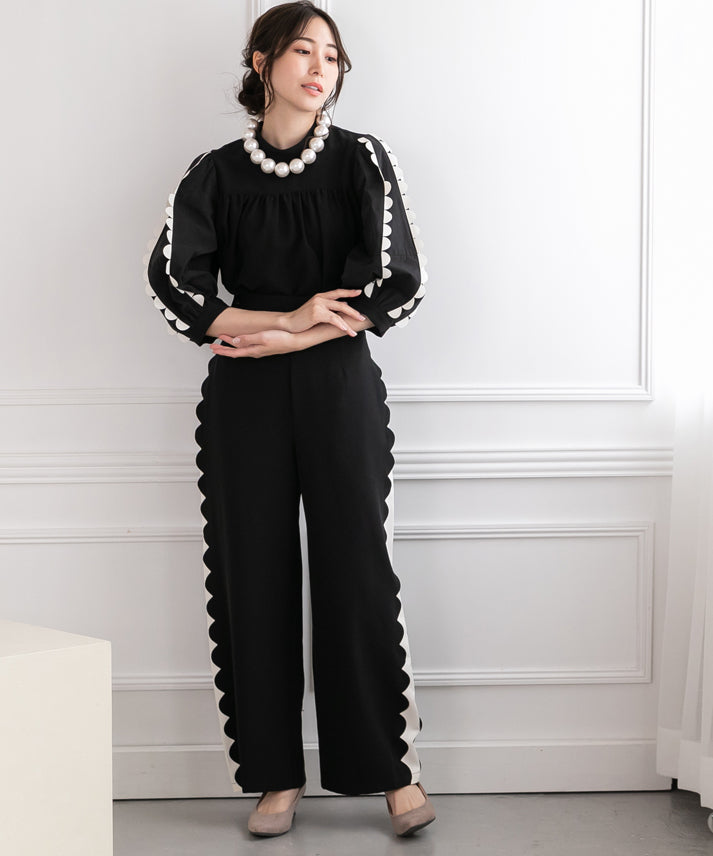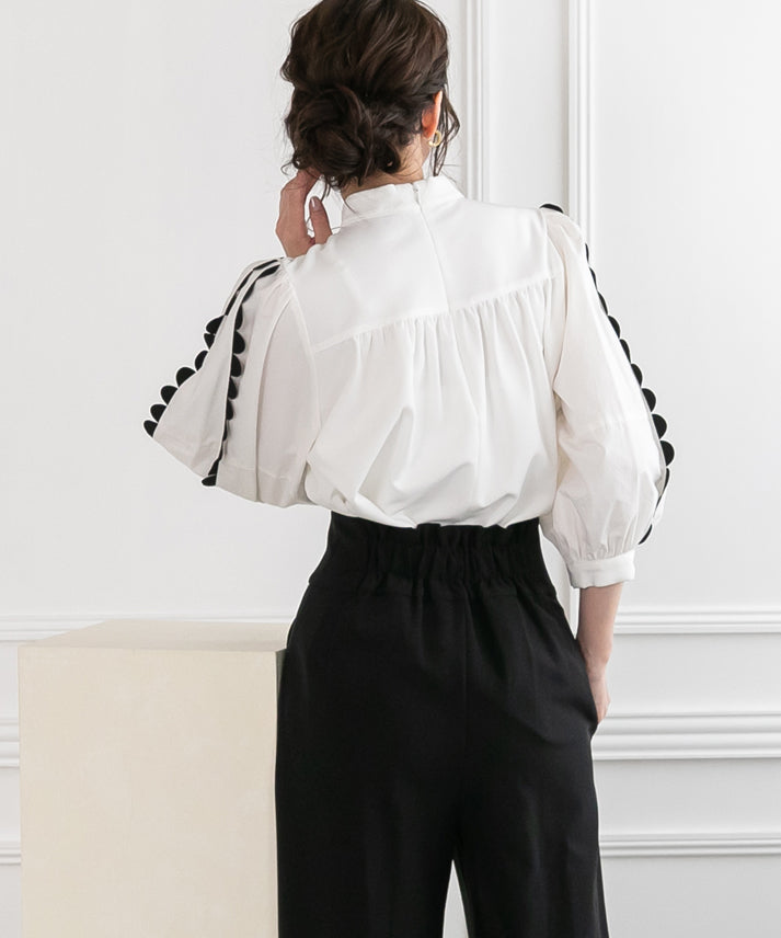 袖のスカラップがアクセントになったブラウス。モノトーンの配色で甘すぎないフェミニンさを演出し、クラシックな襟デザインが上品さを引き立てます。バストラインのギャザーが女性らしいシルエットを作り、体型カバーにも効果的。ボトムにインしても、そのままふわっと着てもおしゃれに決まるアイテムです。シンプルながらも他にはないデザインで、コーディネートに取り入れるだけで印象を変えてくれる万能な一着です。