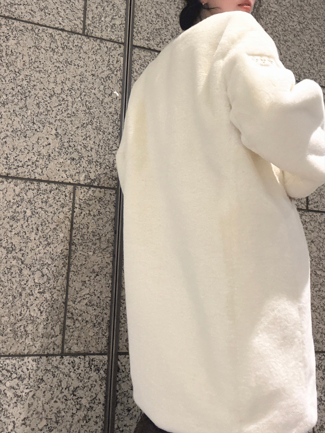 ラビットファーのような艶やかさを持つ、ポリエステル糸のエコファーを使用しているノーカラーコート。