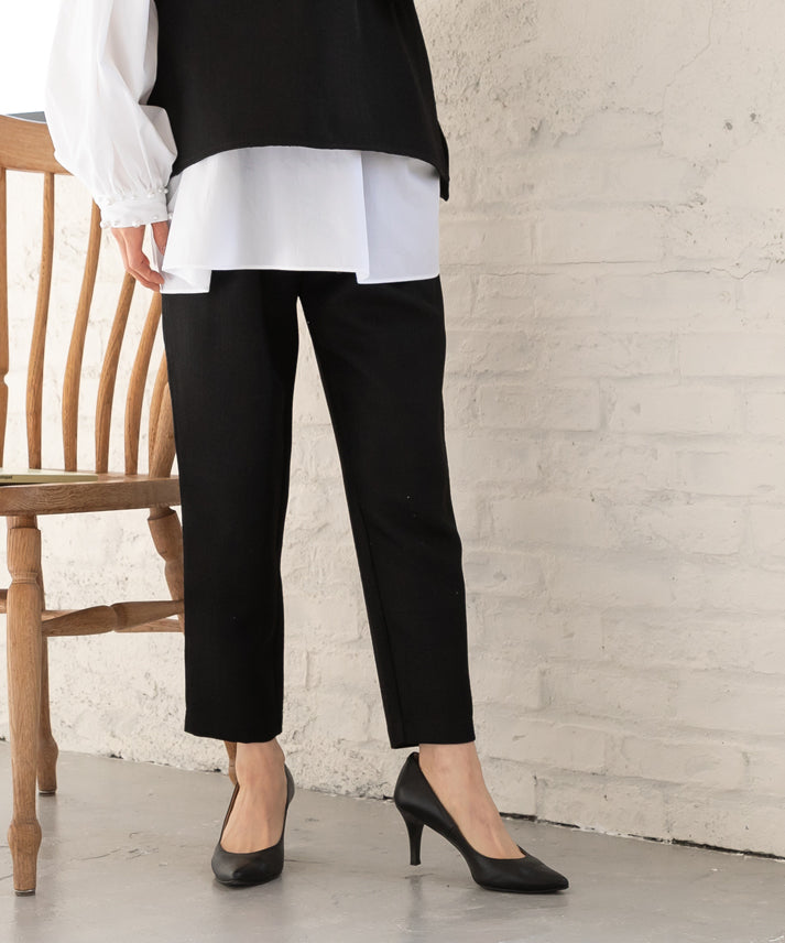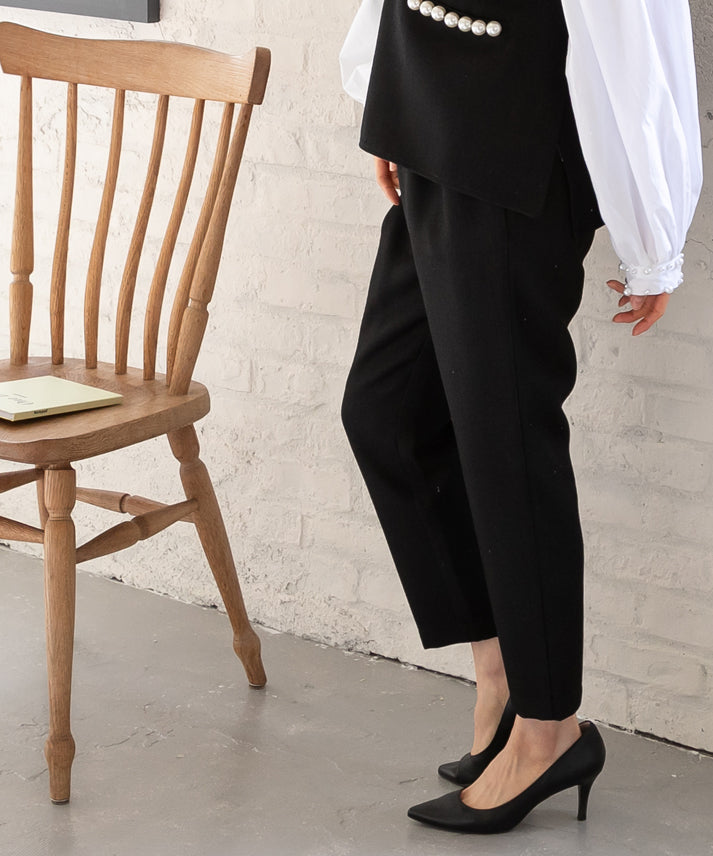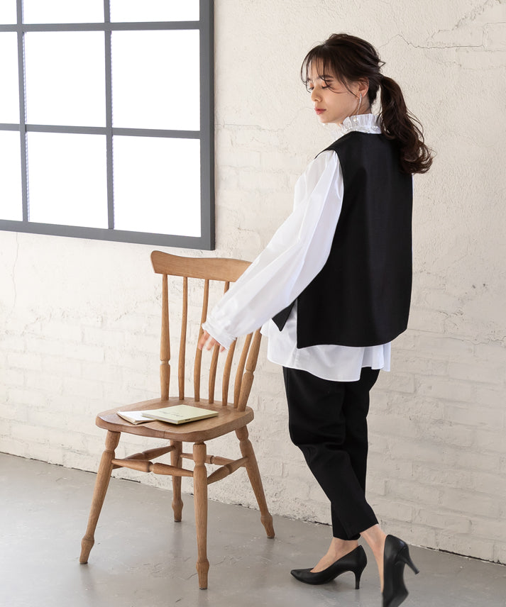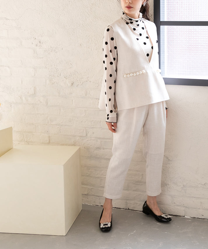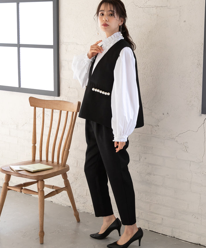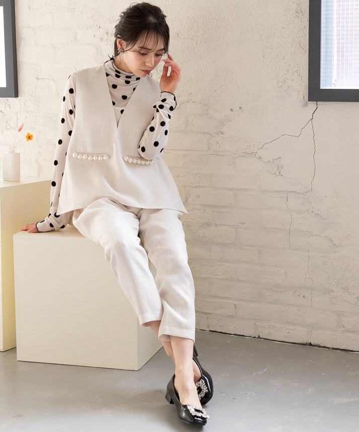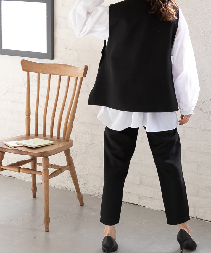 パールボタンをアクセントにしたジレとクロップドパンツを組み合わせた、エレガントなツイードセットアップ(ジレは別売)。ノースリーブデザインのジレは、インナーを変えることで様々な雰囲気に対応し、多様なスタイリングが楽しめます。体型を美しく見せるシルエットと実用性を備え、機能性とファッション性が融合した万能アイテム。日常から特別な日までどの季節にも適し、日々の装いをワンランク上のスタイルへと昇華させます。